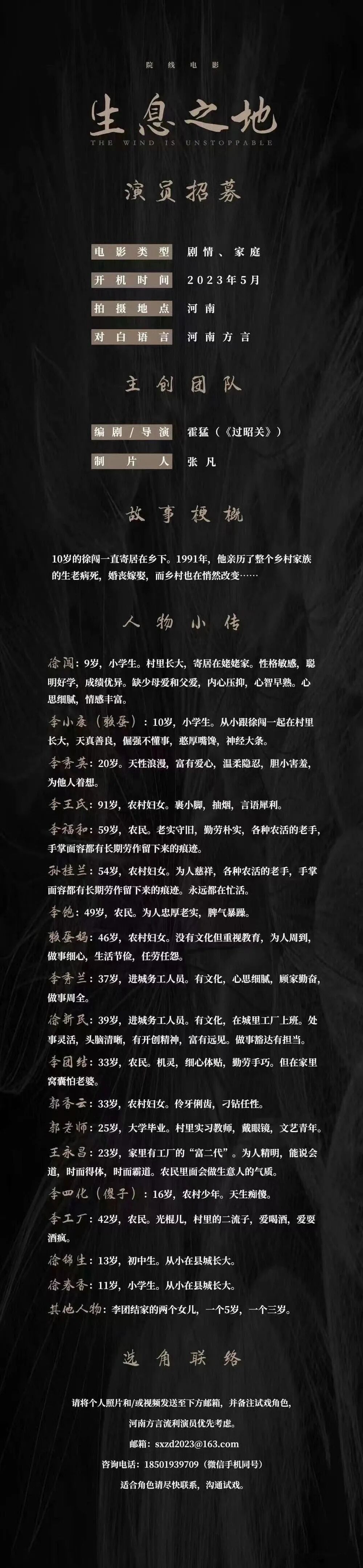 请将个人照片和视频发送至邮箱,并备注试戏角色,河南方言流利演员优先考虑。