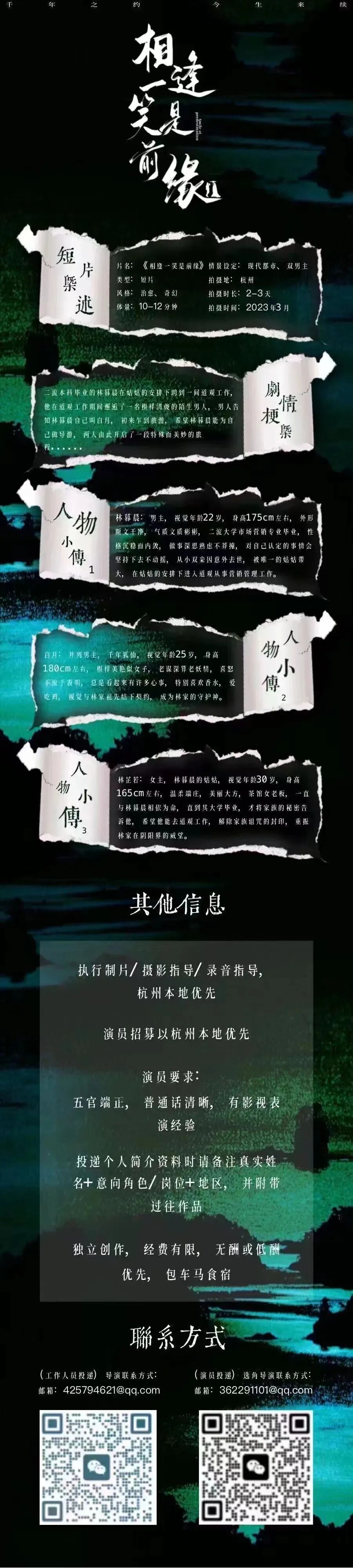 执行制片/摄影指导/录音指导,杭州本地优先,演员招募以杭州本地优先。
