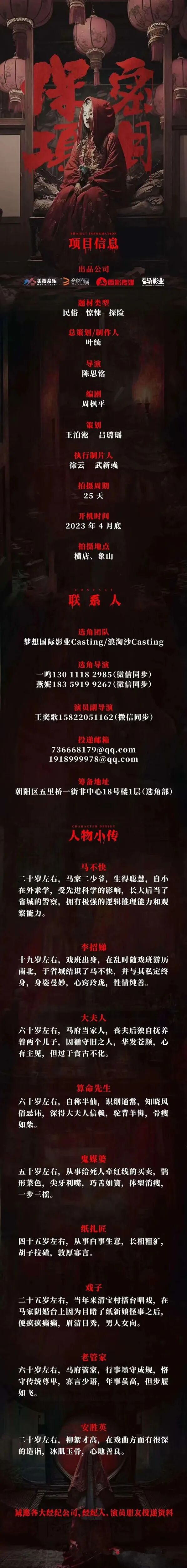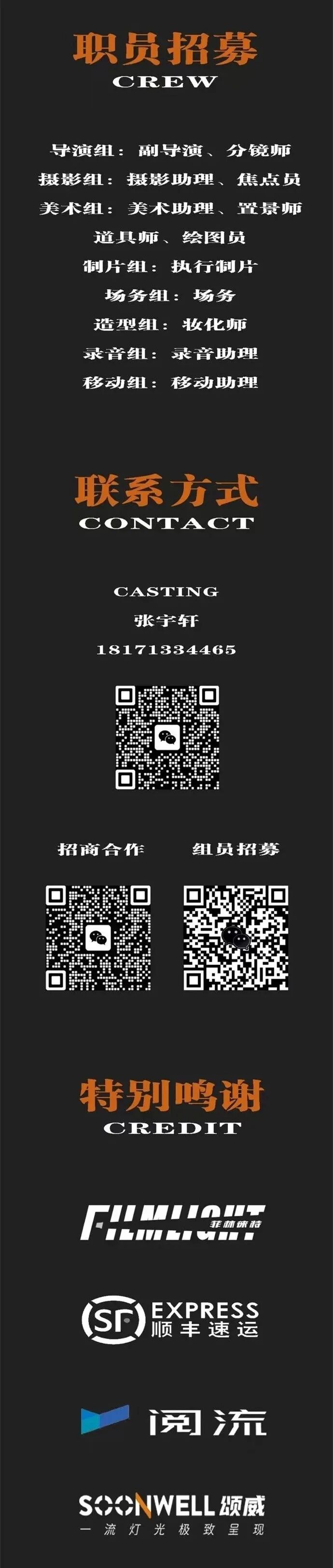 本栏目发布组讯由小编采集与业界共享,组讯如有变化请以实际情况为准。如果遇到剧组收费情况,请谨慎对待并私信官微@戏客Seeker,我们会公示问题组讯并及时处理。谢谢。