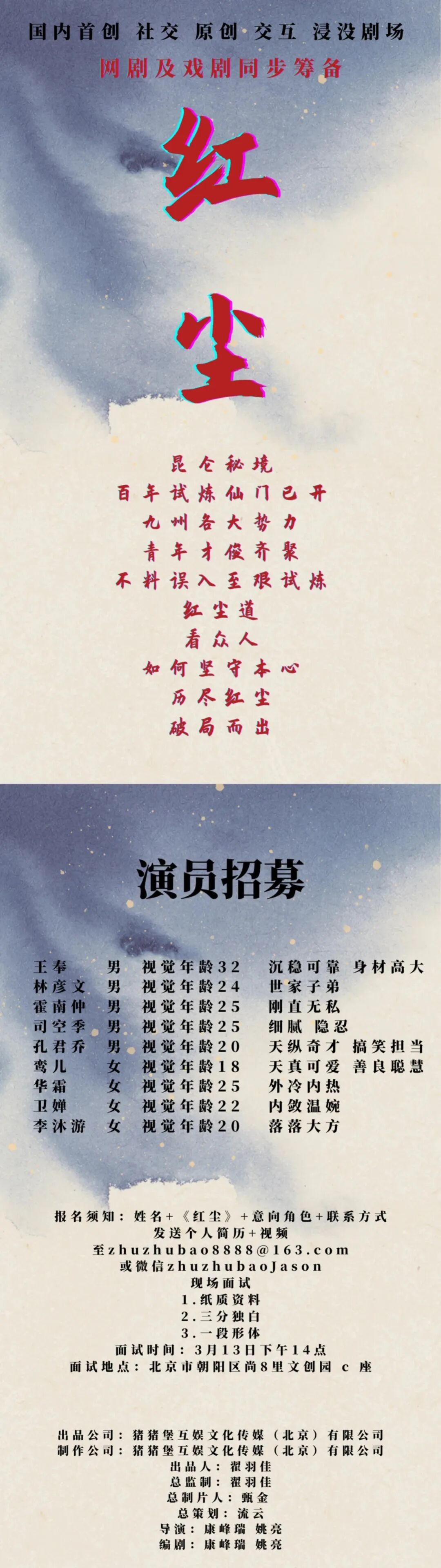 报名须知:姓名+《红尘》+意向角色+联系方式,发送个人简历+视频至邮箱。
