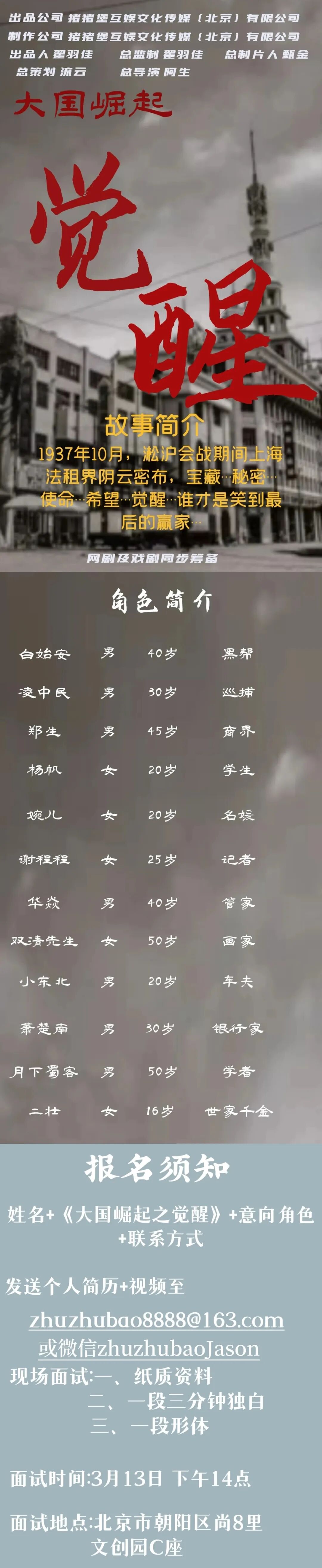 报名须知:姓名+《大国崛起之觉醒》+意向角色+联系方式,发送个人简历+视频至邮箱。