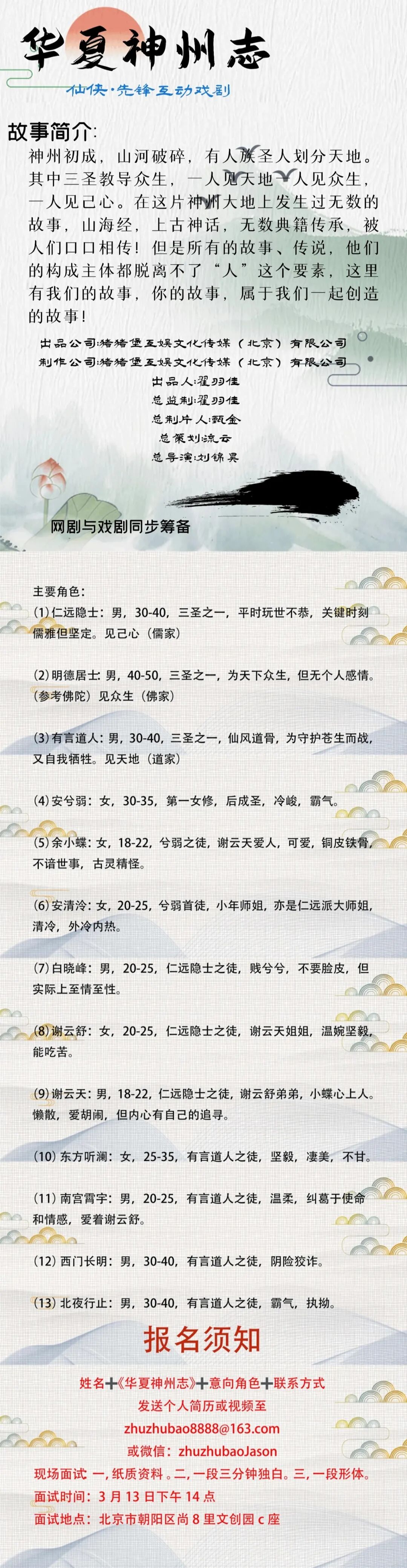 报名须知:姓名+《华夏神州志》+意向角色+联系方式,发送个人简历+视频至邮箱。