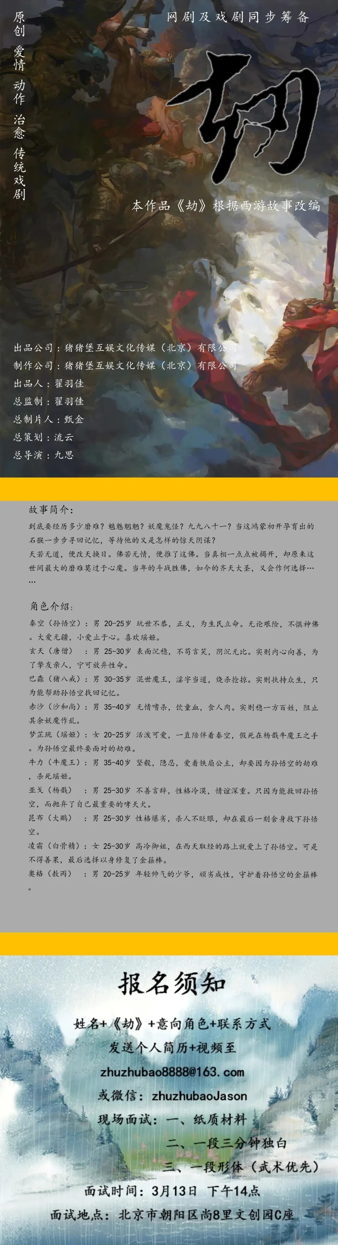 报名须知:姓名+《劫》+意向角色+联系方式,发送个人简历+视频至邮箱。