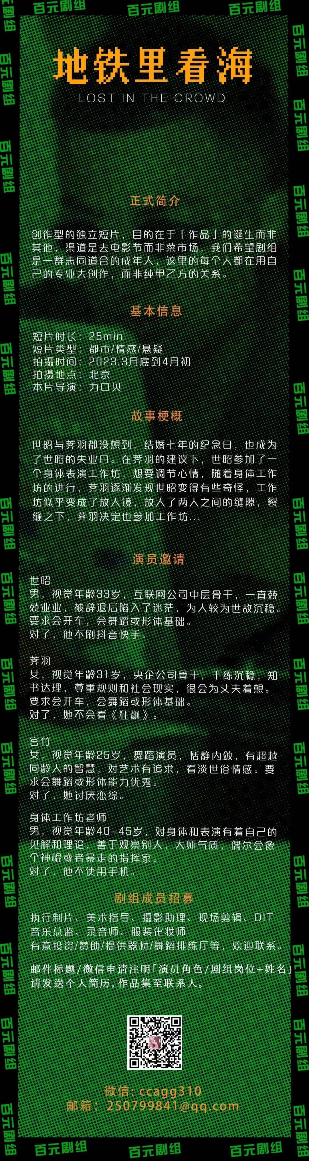 本栏目发布组讯由小编采集与业界共享,组讯如有变化请以实际情况为准。如果遇到剧组收费情况,请谨慎对待并私信官微@戏客Seeker,我们会公示问题组讯并及时处理。谢谢。