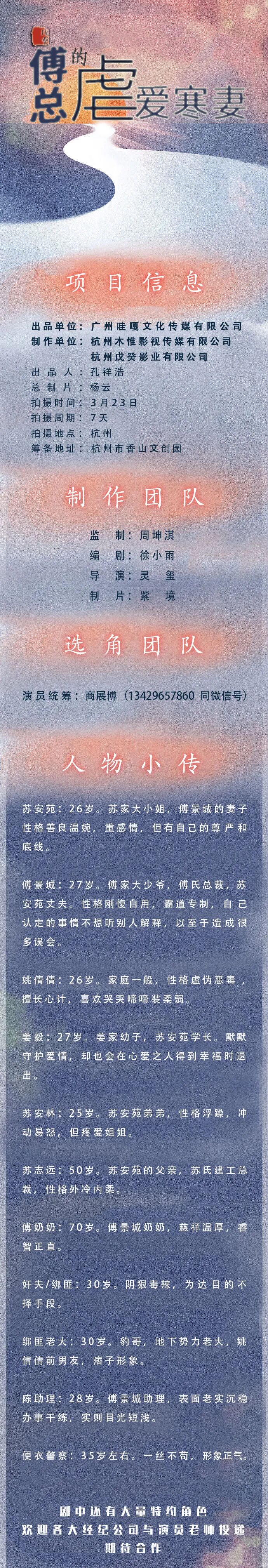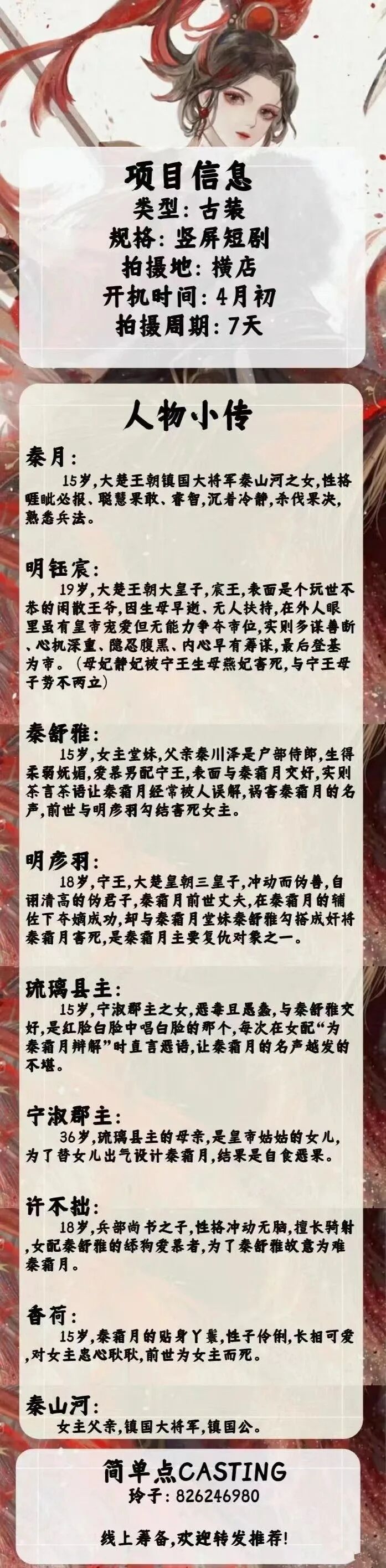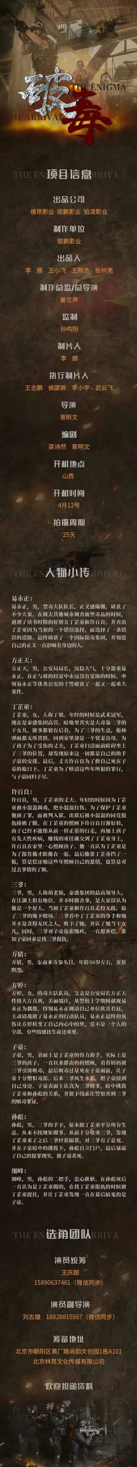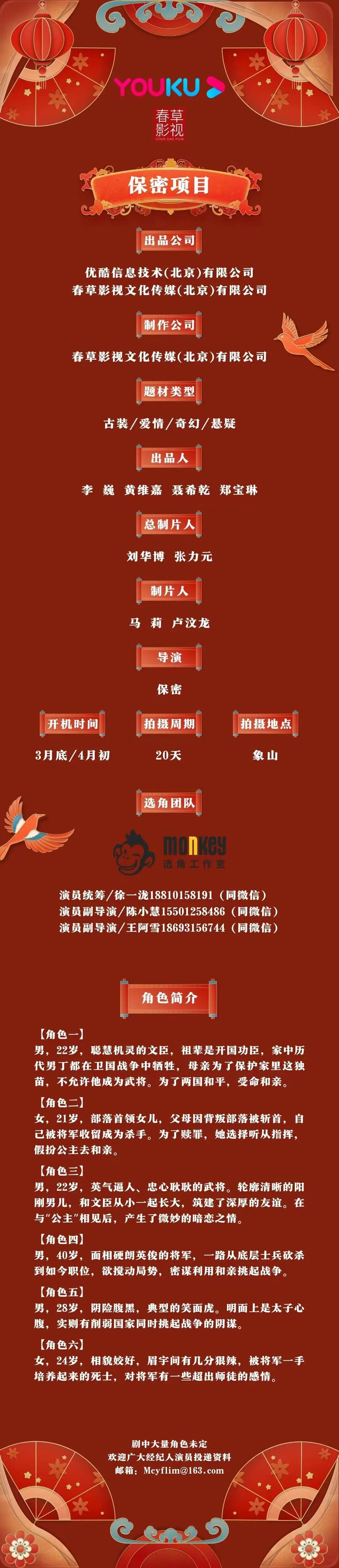 剧中大量角色未定,欢迎广大经纪人演员投递资料。