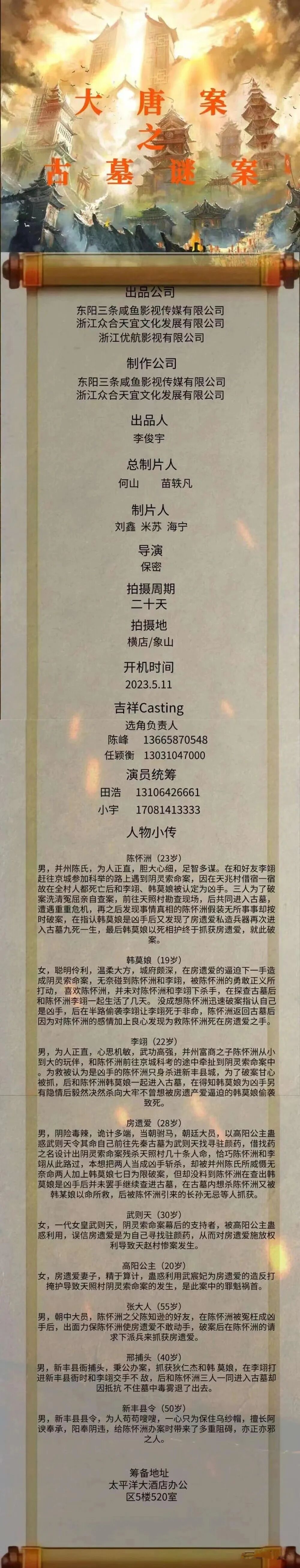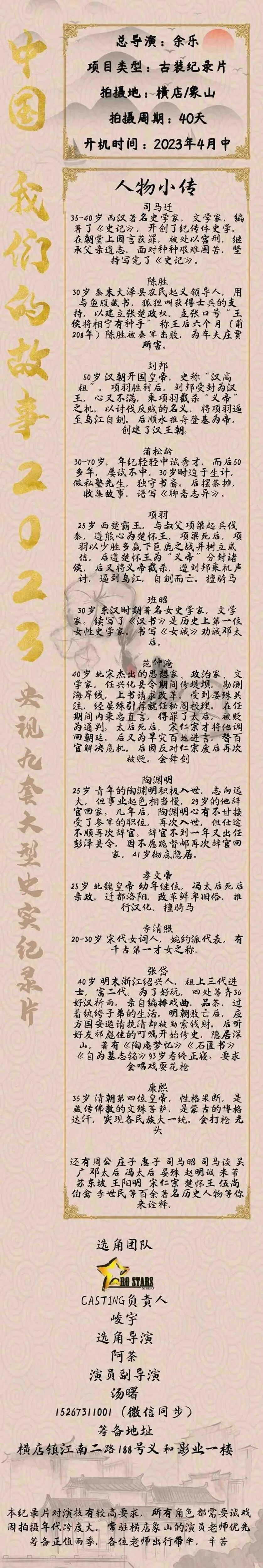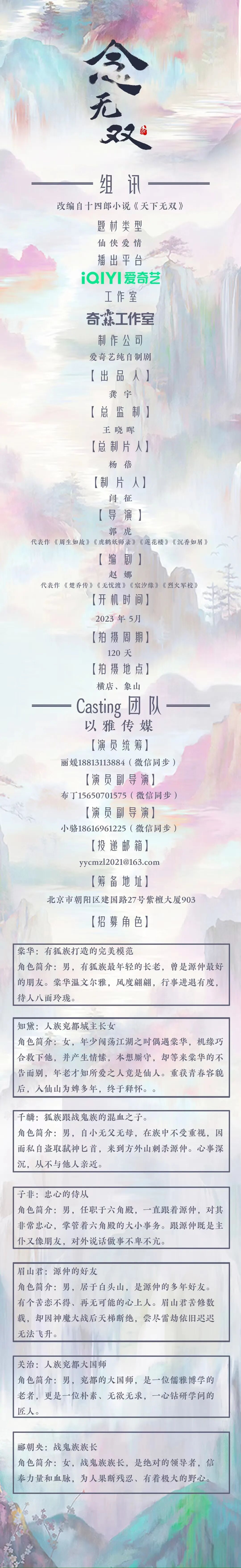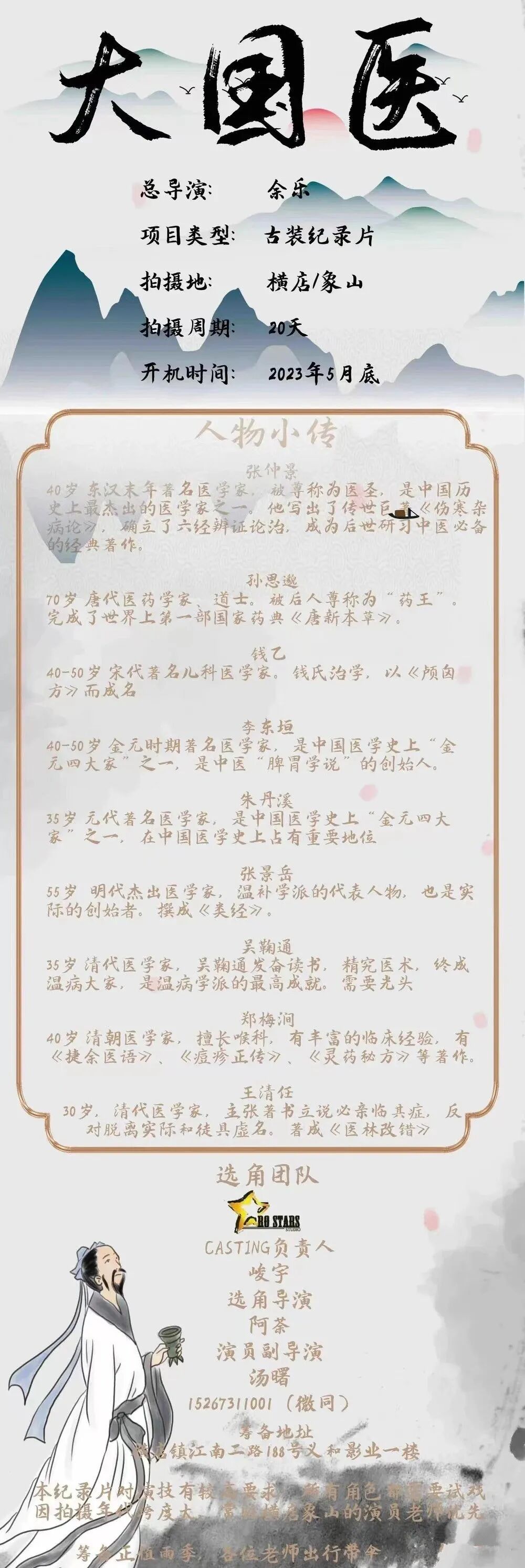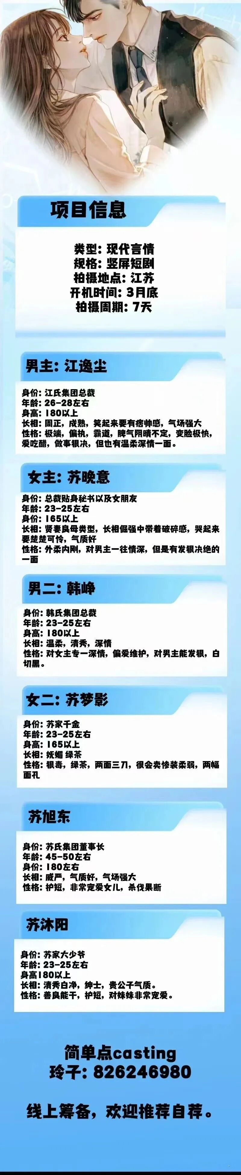 剧中大量角色未定,欢迎广大经纪人演员投递资料。