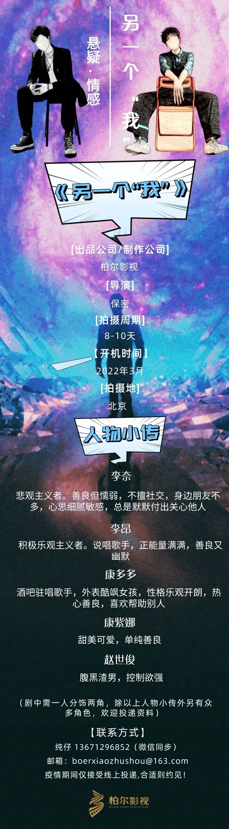 剧中需一人分饰两角,另有众多角色,欢迎投递资料,疫情期间仅接受线上投递,合适则约见!
