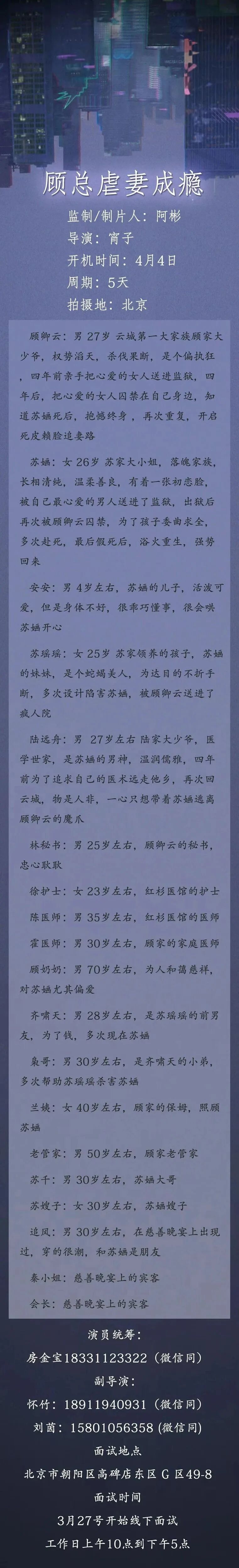 本栏目发布组讯由小编采集与业界共享,组讯如有变化请以实际情况为准。如果遇到剧组收费情况,请谨慎对待并私信官微@戏客Seeker,我们会公示问题组讯并及时处理。谢谢。