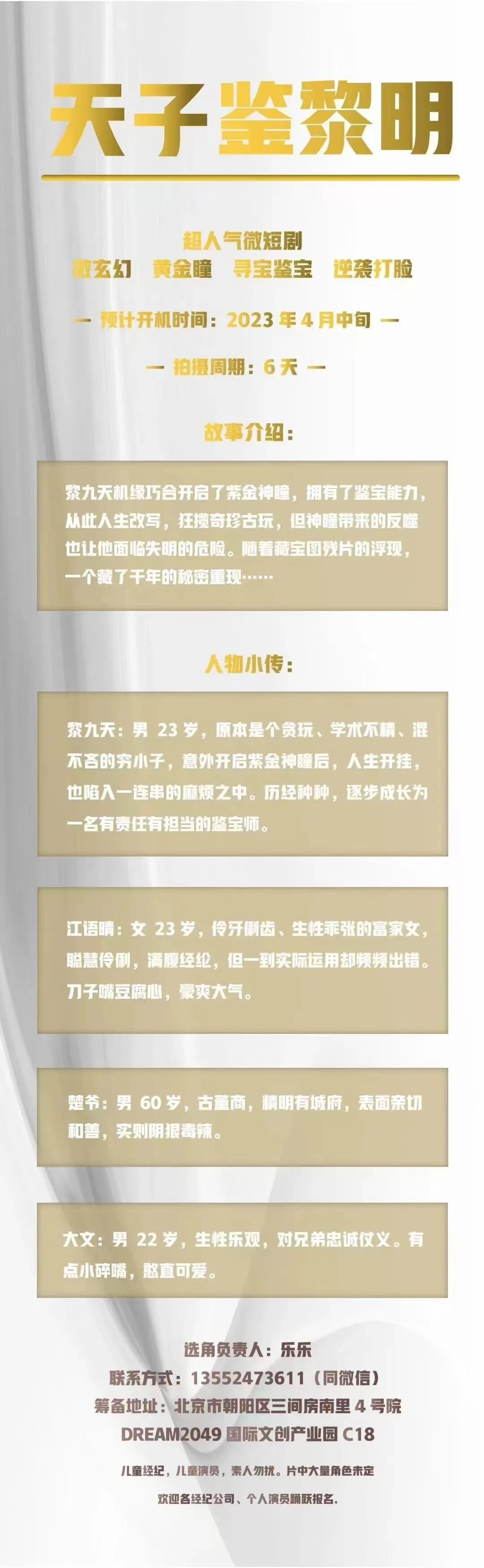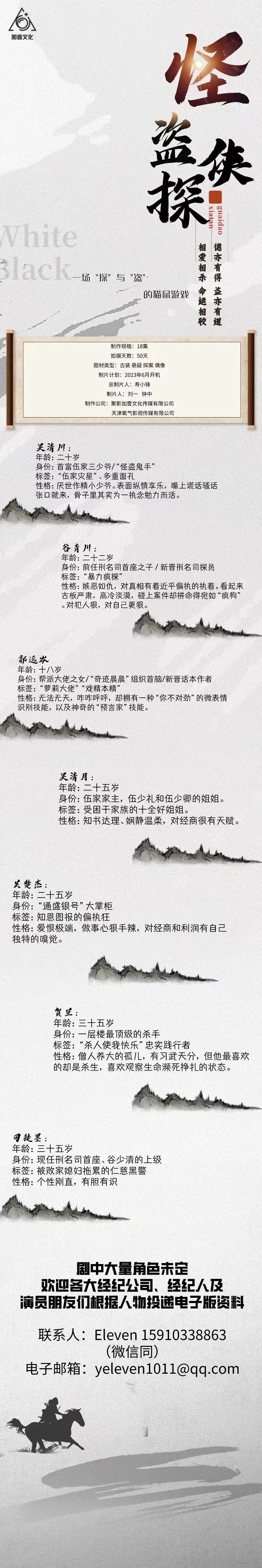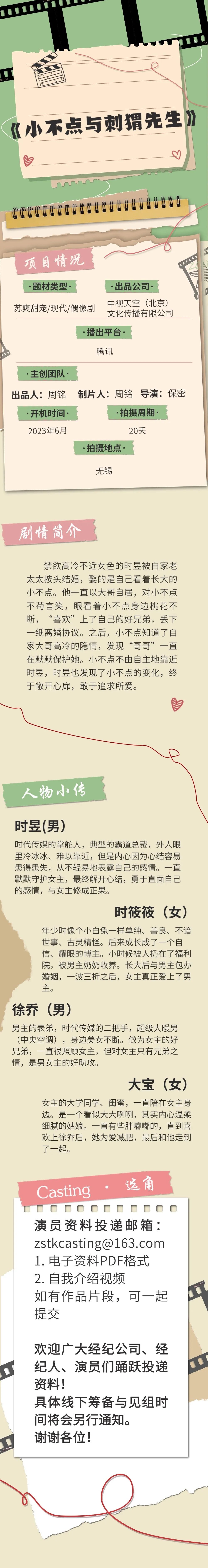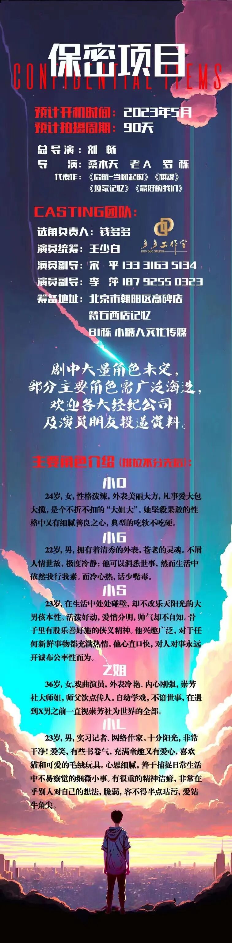 剧中大量角色未定,欢迎各大经纪公司、经纪人及演员朋友们根据人物投递电子版资料。