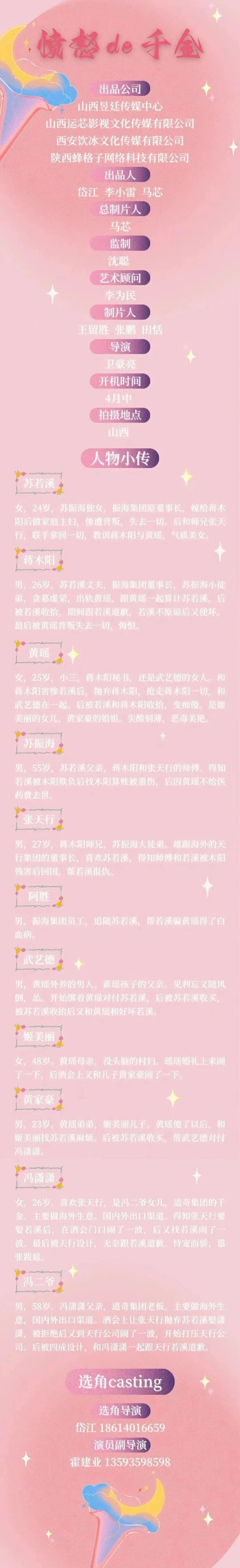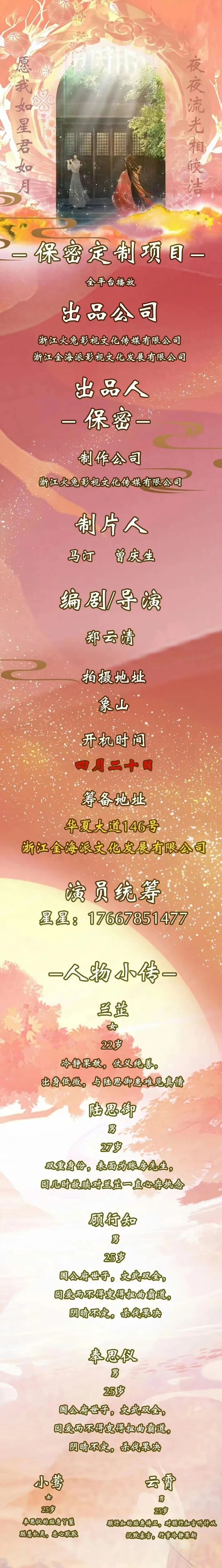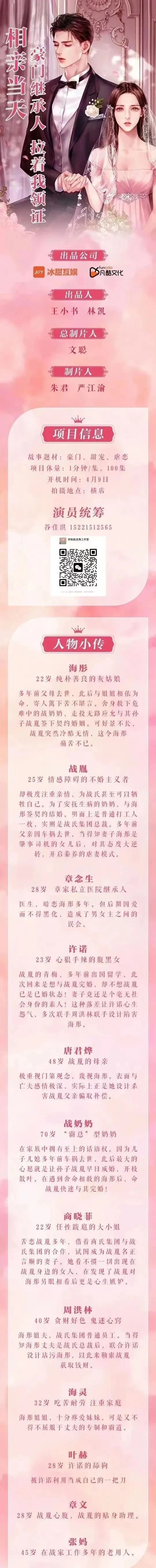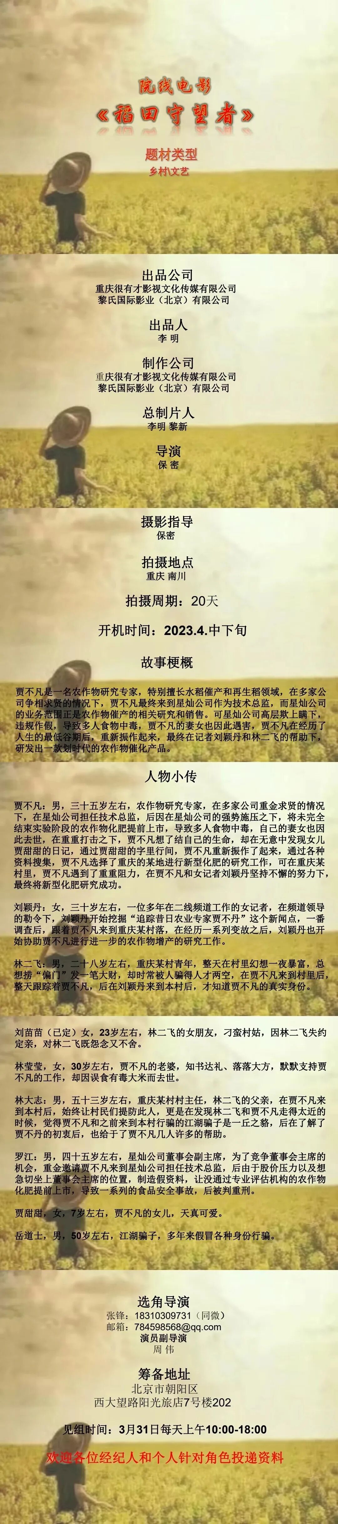 剧中大量角色未定,欢迎各大经纪公司、经纪人及演员朋友们根据人物投递电子版资料。