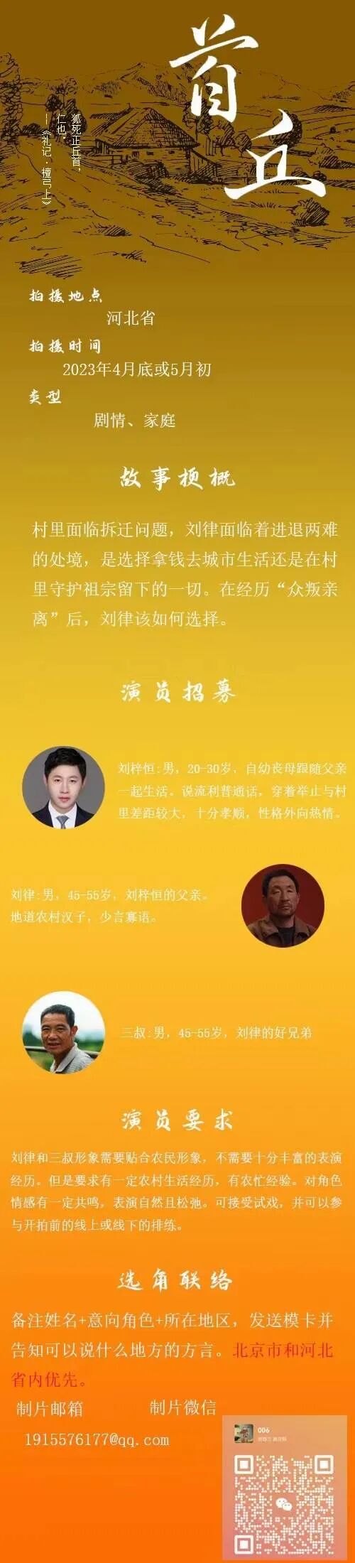 选角联络备注姓名+意向角色+所在地区,发送模卡并告知可以说什么地方的方言。北京市和河北省内优先。