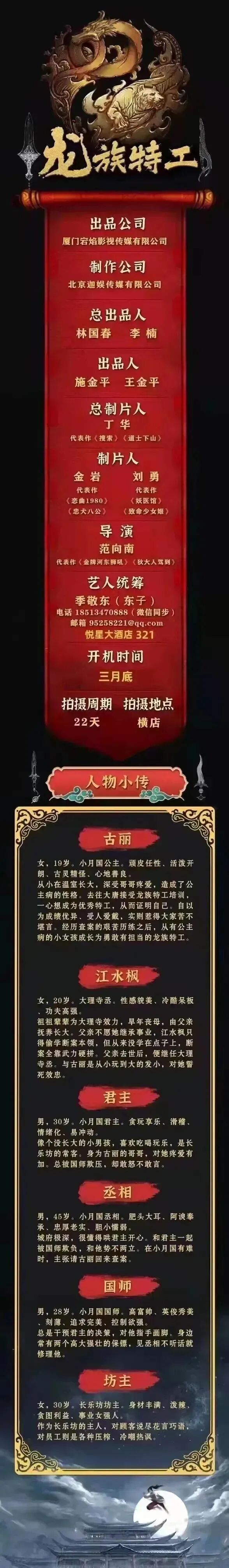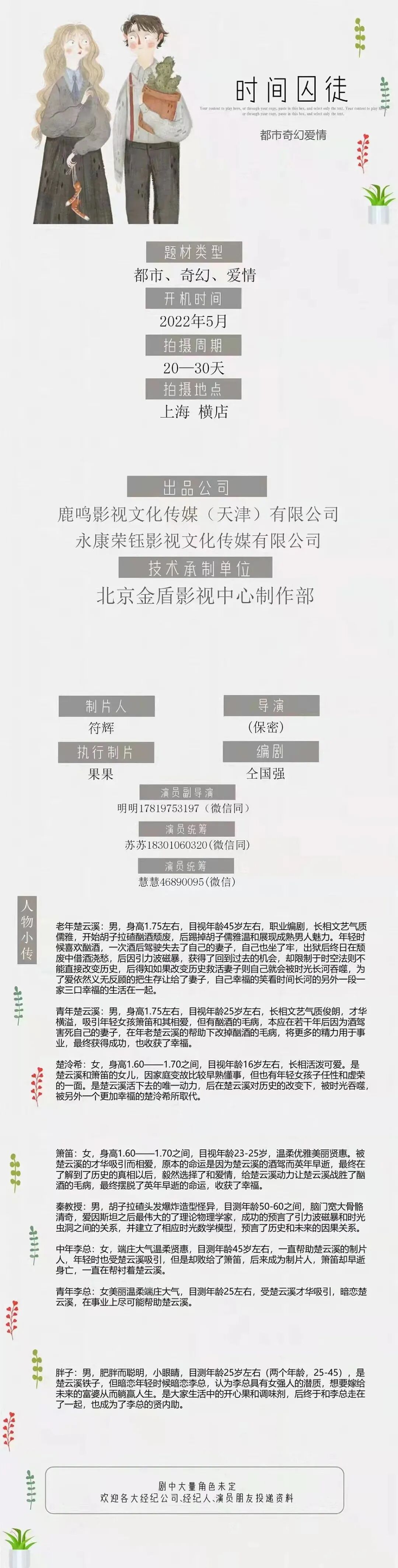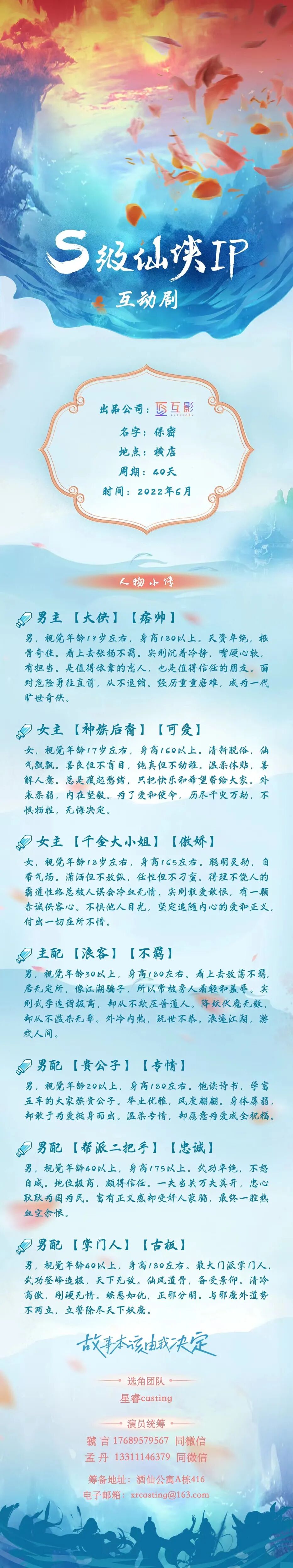 剧中大量角色未定,欢迎各大经纪公司、经纪人、演员朋友投递资料。