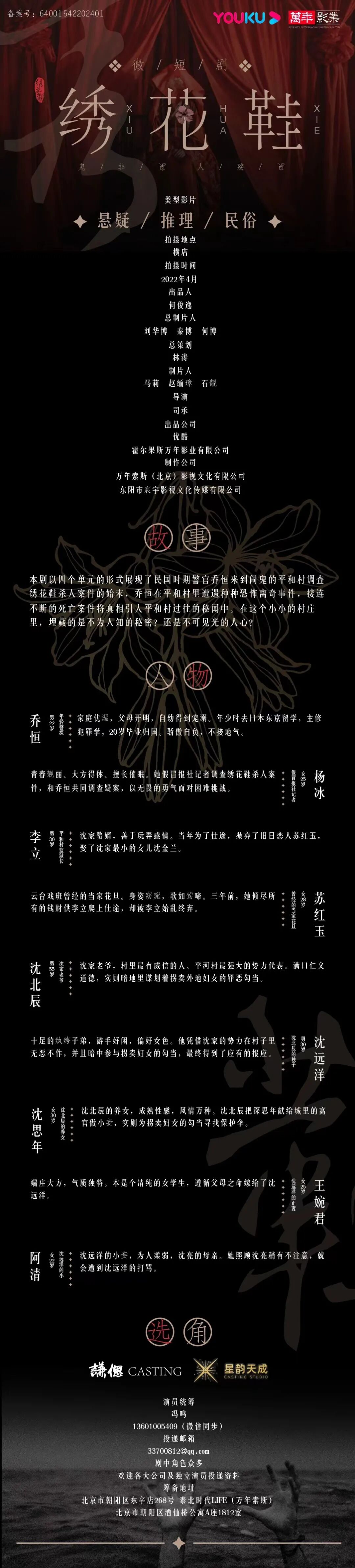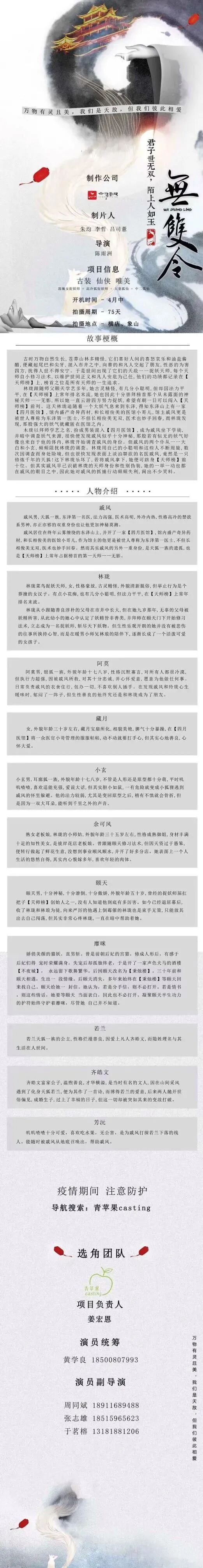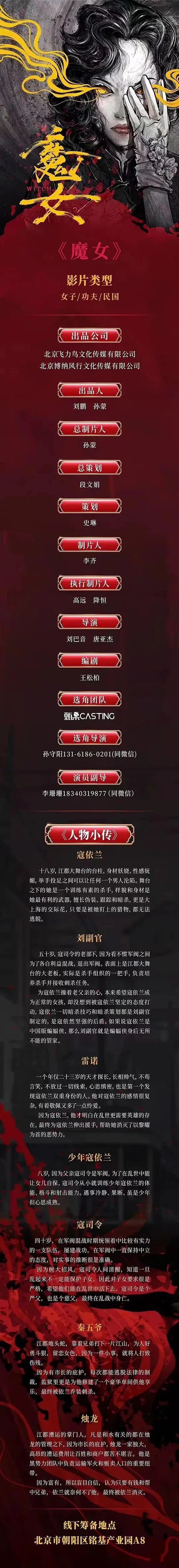 剧中大量角色未定,欢迎各大经纪公司、经纪人、演员朋友投递资料。