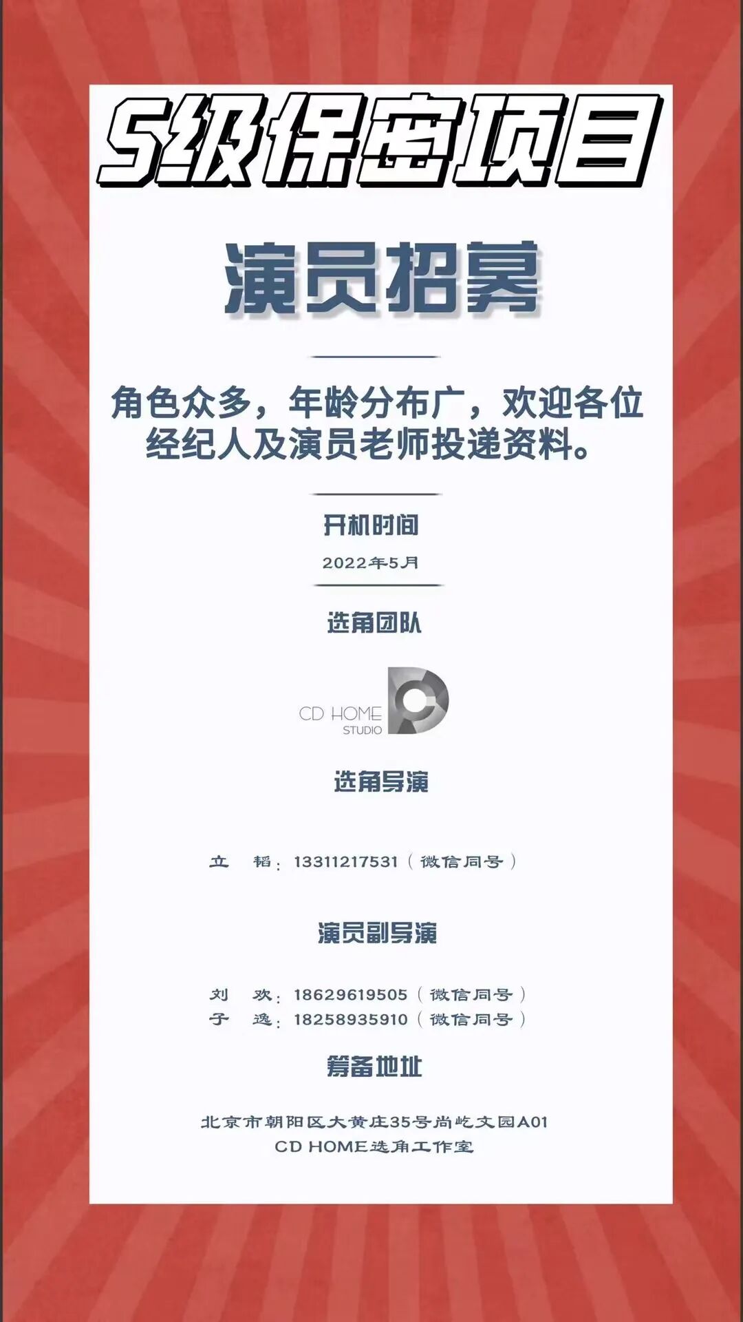 筹备地址:北京市朝阳区大黄庄35号尚屹文园A01 CD HOME选角工作室