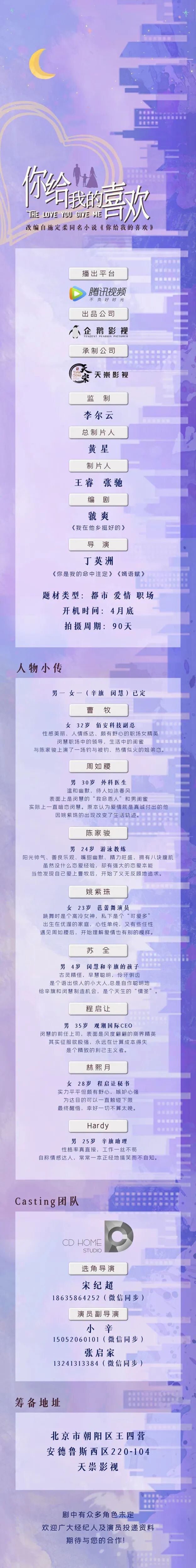 筹备地址:北京市朝阳区大黄庄35号尚屹文园A01层CD HOME选角工作室