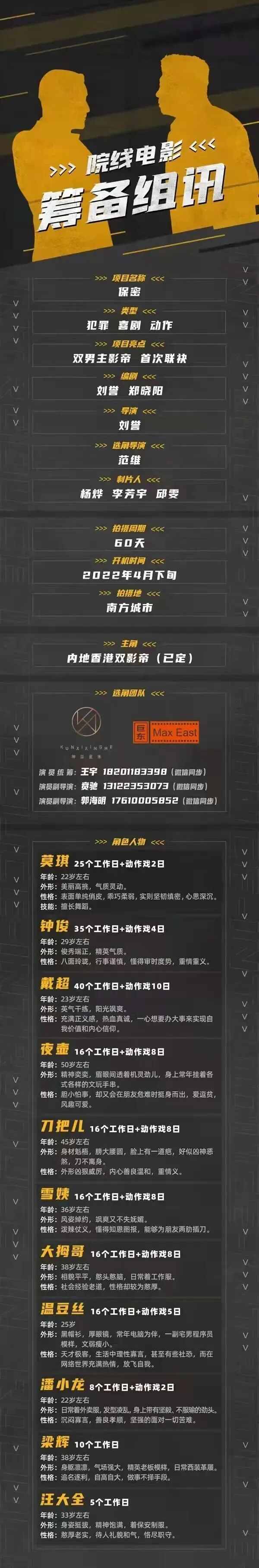 本片众多角色未定,以香港演员为主。欢迎各位演员以及经纪人朋友投递资料。