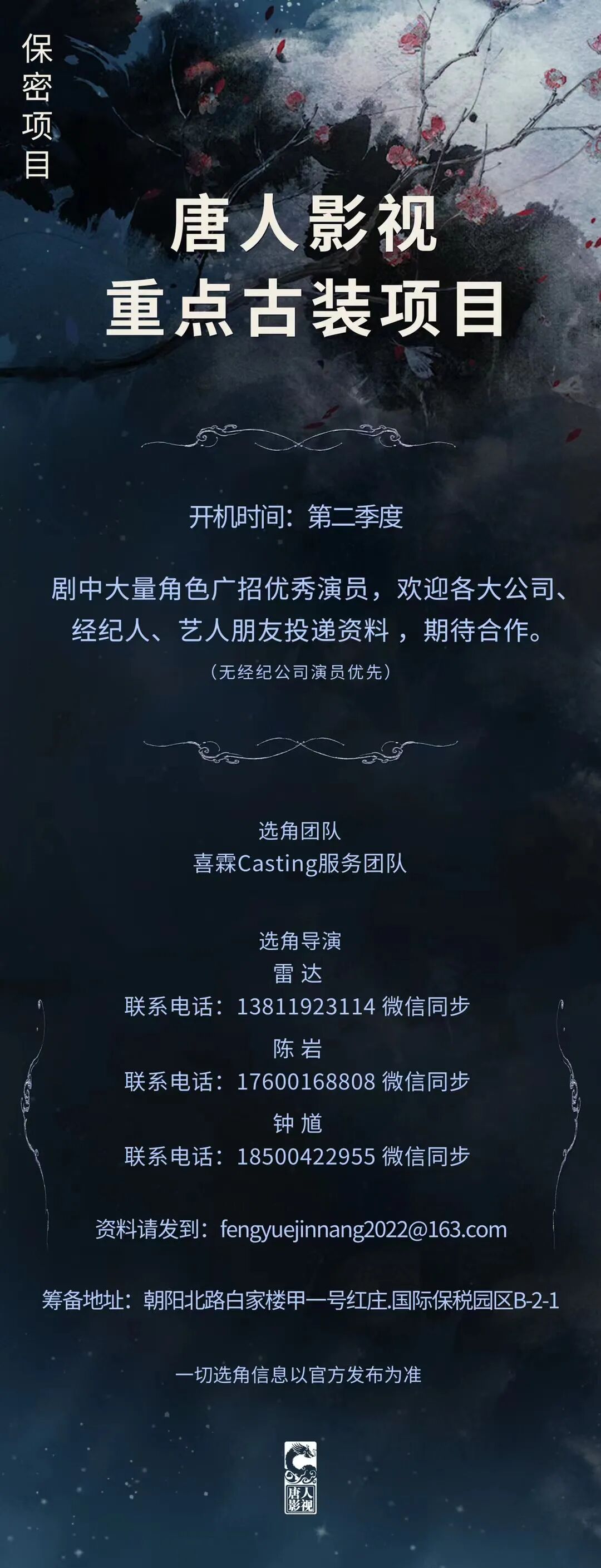 一切选角信息以官方发布为准,剧中大量角色广招优秀演员,欢迎各大公司、经纪人、艺人朋友投递资料,期待合作。(无经纪公司演员优先)