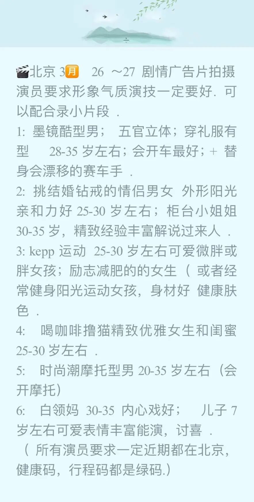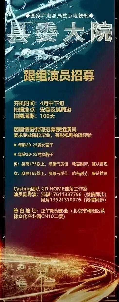 因剧情需要现招募跟组演员,要求专业院校毕业,有影视剧拍摄经验