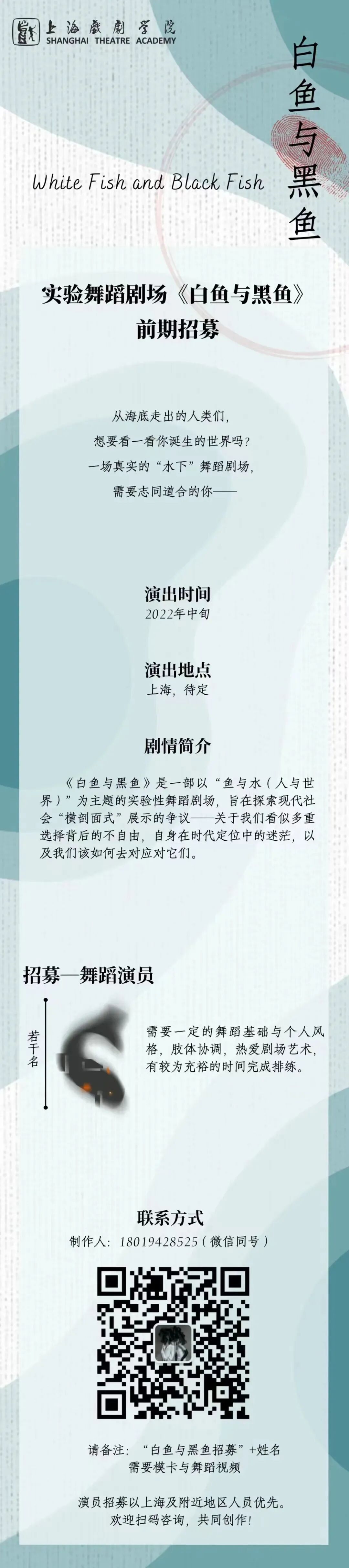 请备注:“白鱼与黑鱼招募”+姓名,需要模卡与舞蹈视频,演员招募以上海及附近地区人员优先。