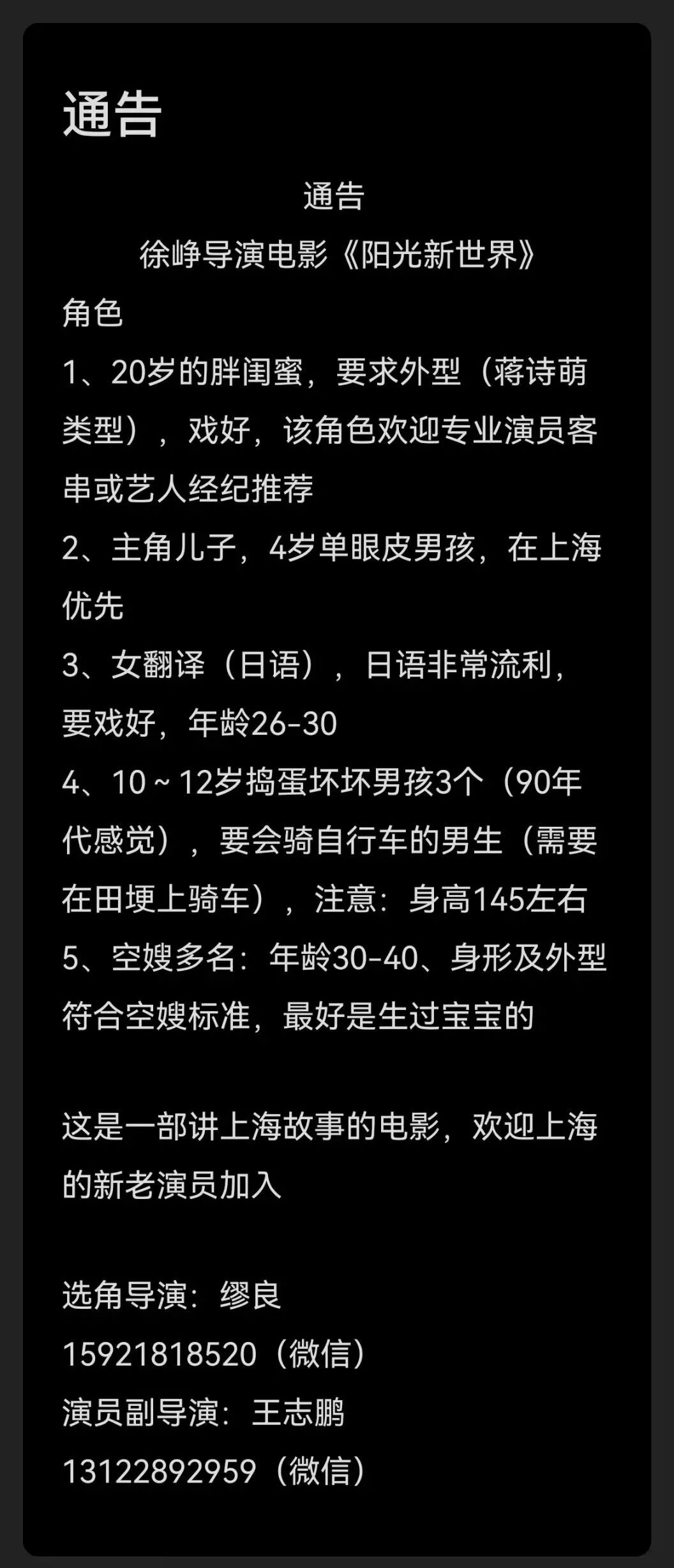 这是一部讲上海故事的电影,欢迎上海的新老演员加入