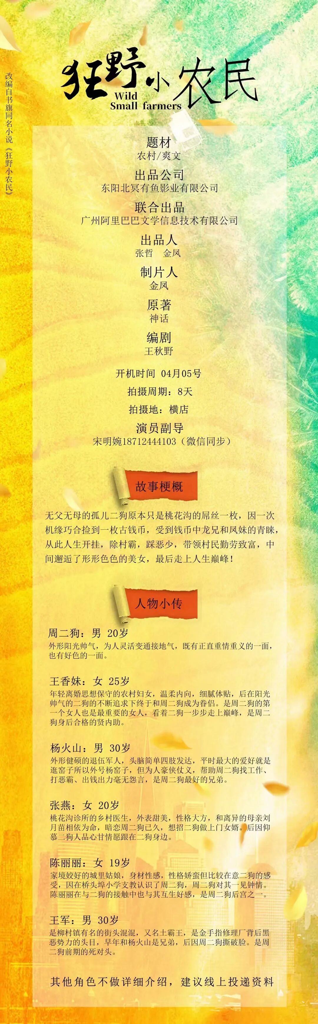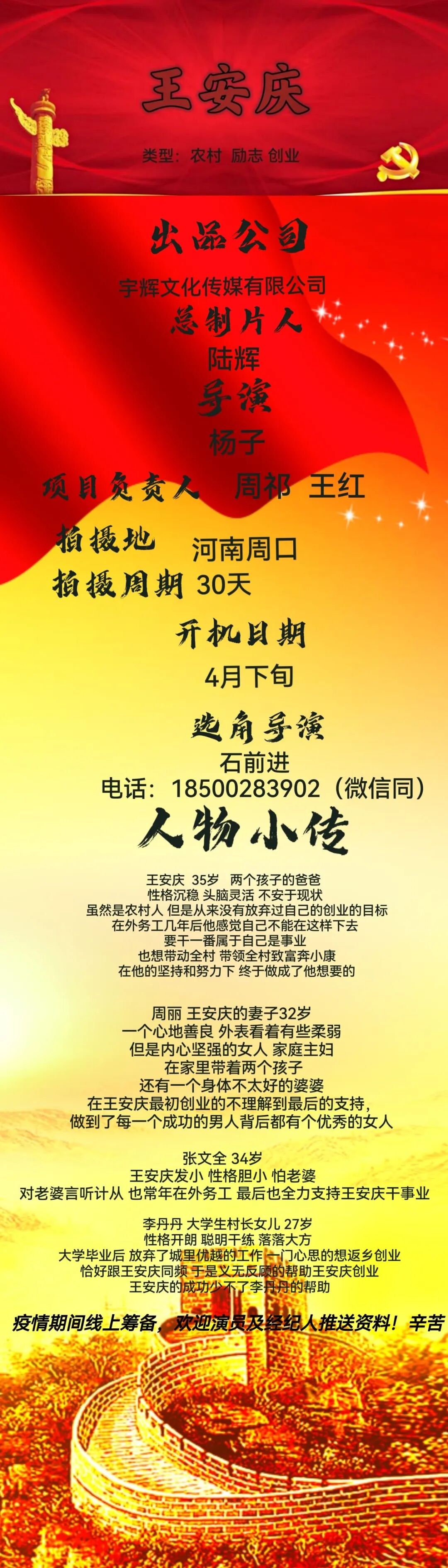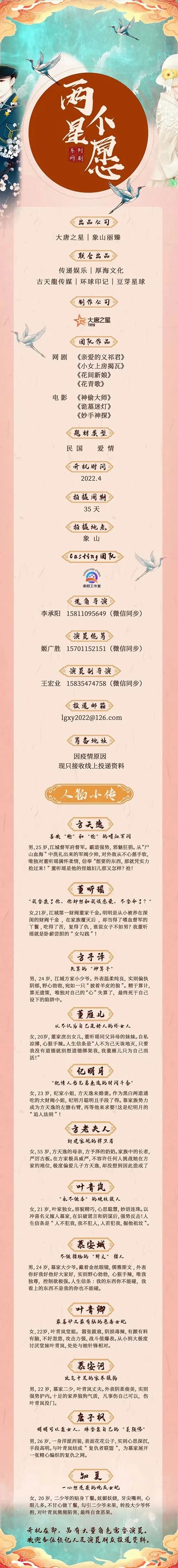 因疫情原因,现只接收线上投递资料,开机在即,另有大量角色需要演员。欢迎各位经纪人及演员朋友投递资料。