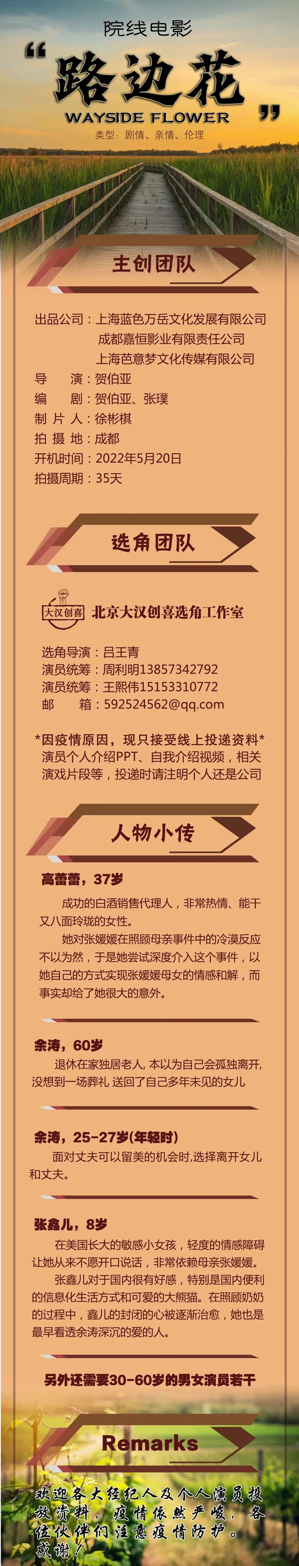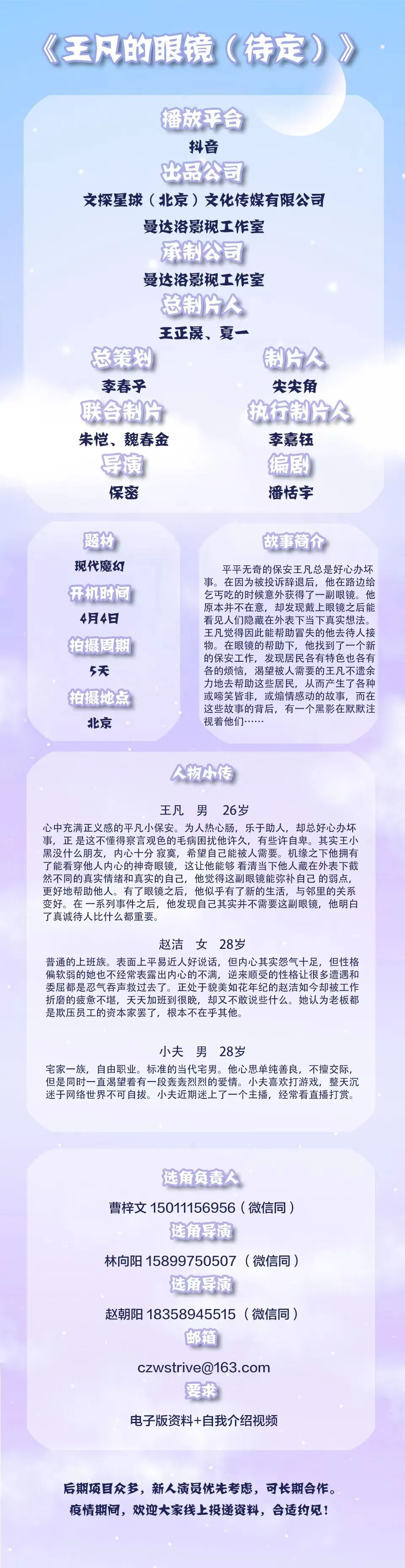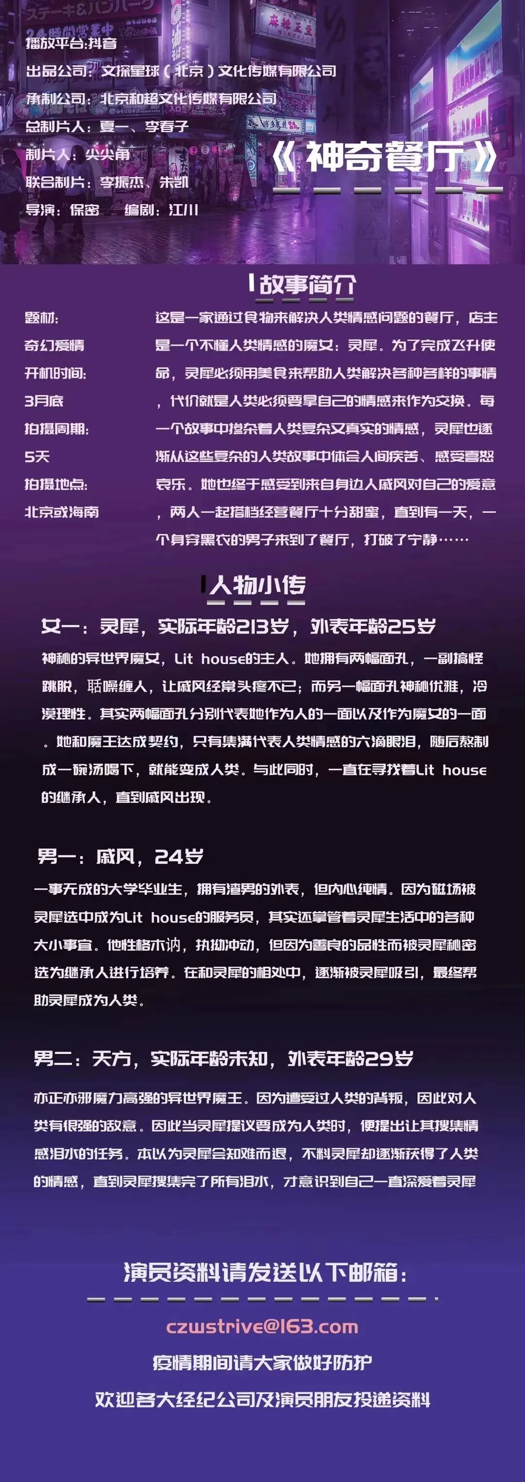 疫情期间请大家做好防护,欢迎各大经纪公司及演员朋友投递资料。