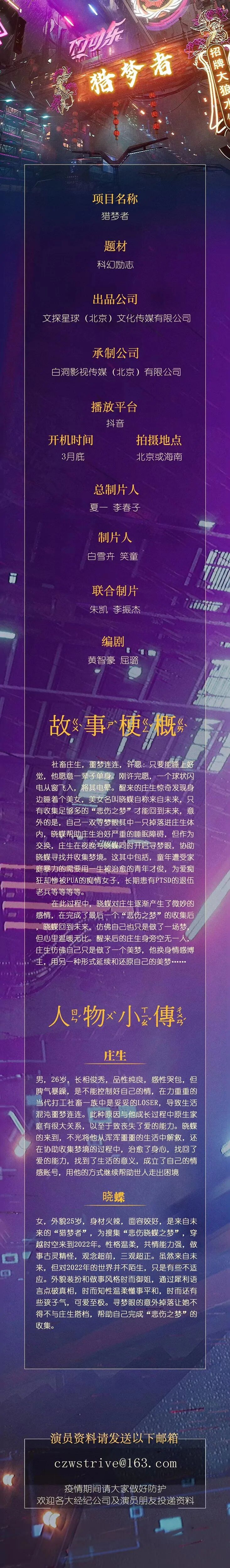 因疫情原因,现只接受线上投递资料,演员个人介绍PPT、自我介绍视频,相关演戏片段等,投递时请注明个人还是公司