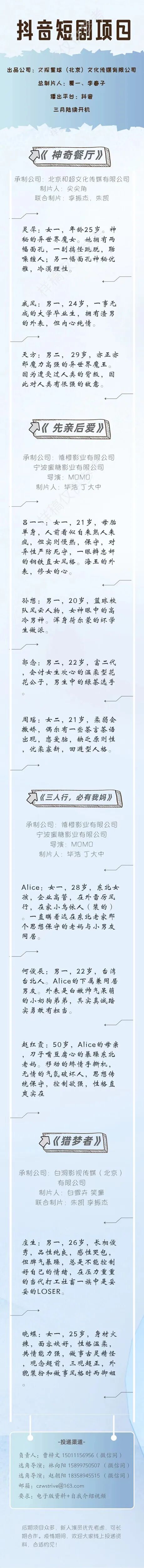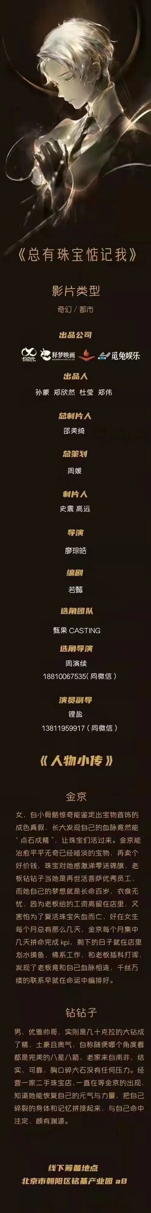 后期项目众多,新人演员优先考虑,可长期合作。疫情期间,欢迎大家线上投递资料,合适约见!