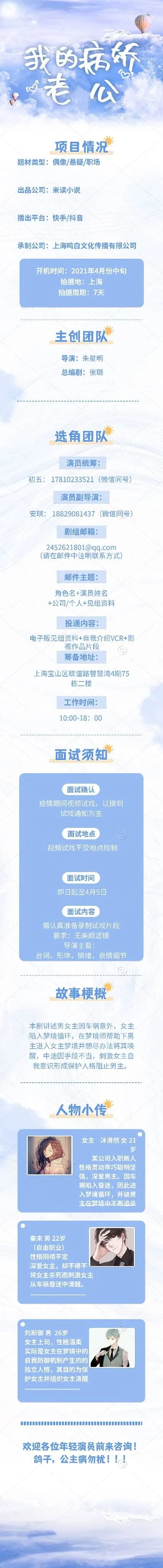 欢迎各大经纪公司和演员投递资料,疫情期间请做好防护,期待与您合作。