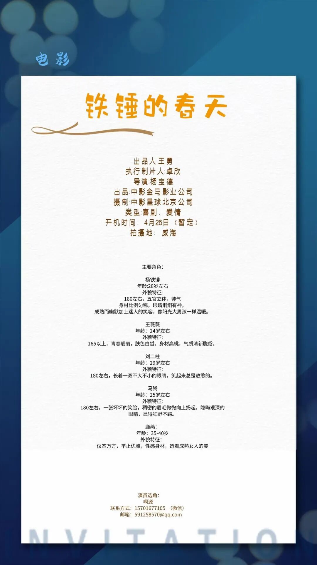 剧中角色众多欢迎各大经纪公司及演员投递资料,疫情期间请各位做好防护。