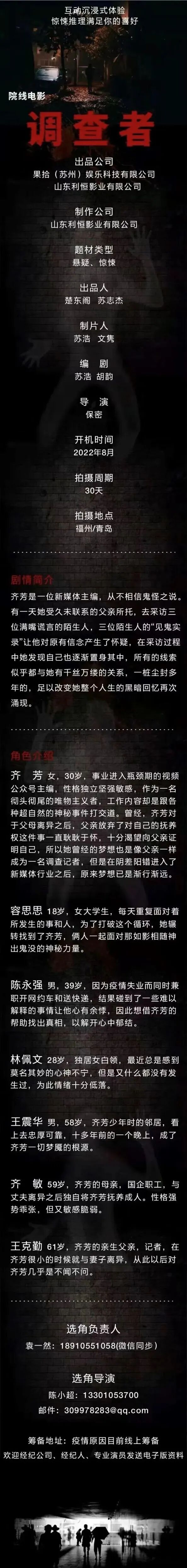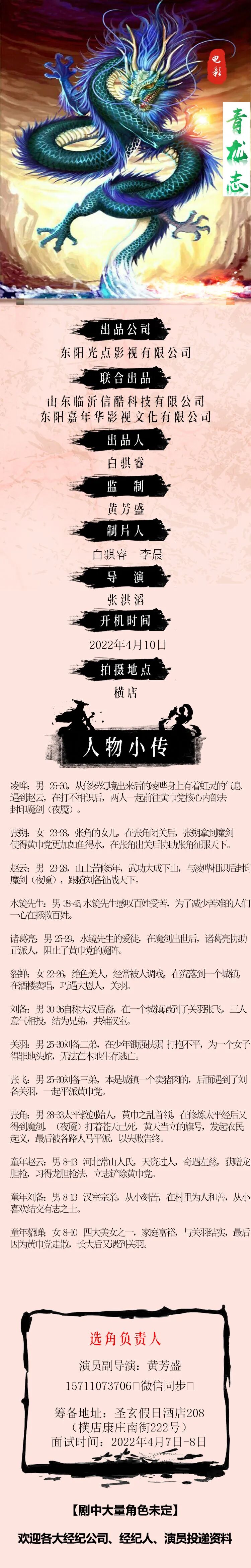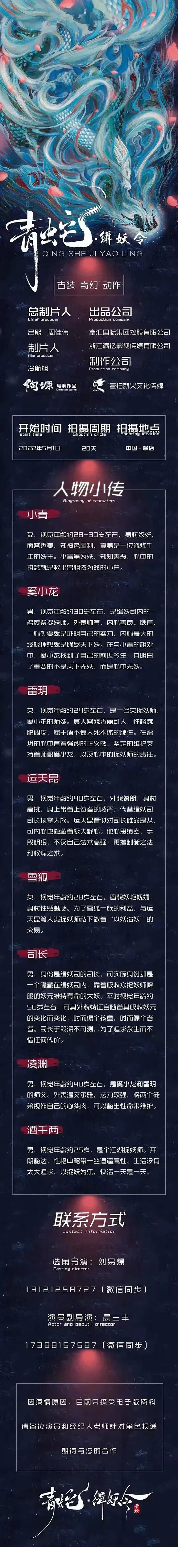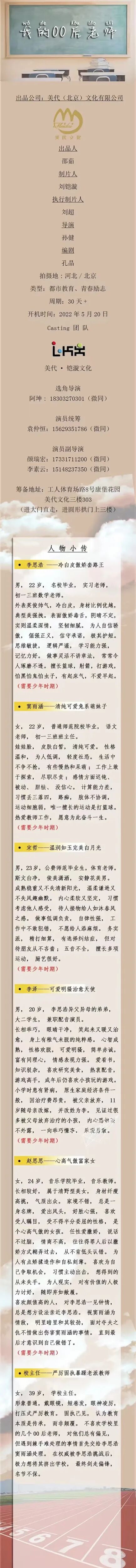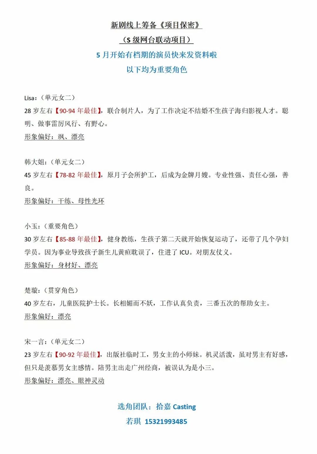 剧中大量角色未定,欢迎各大经纪公司、经纪人、演员投递资料。