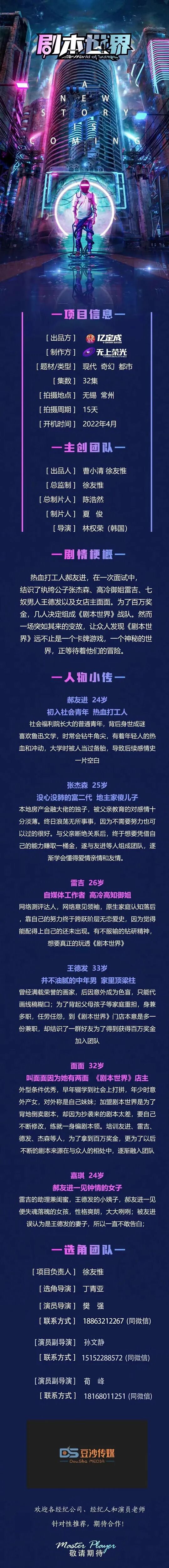 本栏目发布组讯由小编采集与业界共享,组讯如有变化请以实际情况为准。如果遇到剧组收费情况,请谨慎对待并私信官微@戏客Seeker,我们会公示问题组讯并及时处理。谢谢。