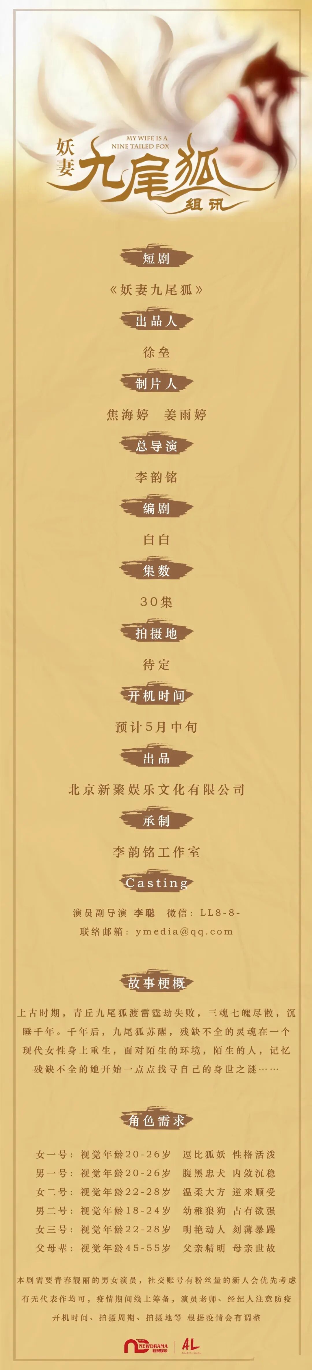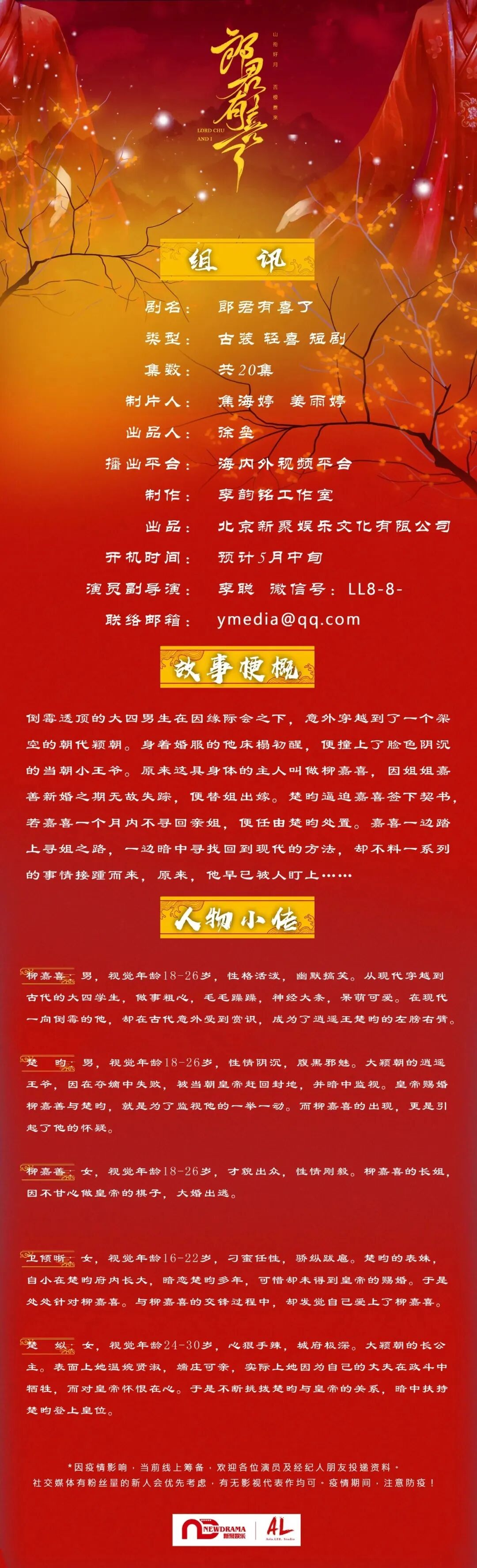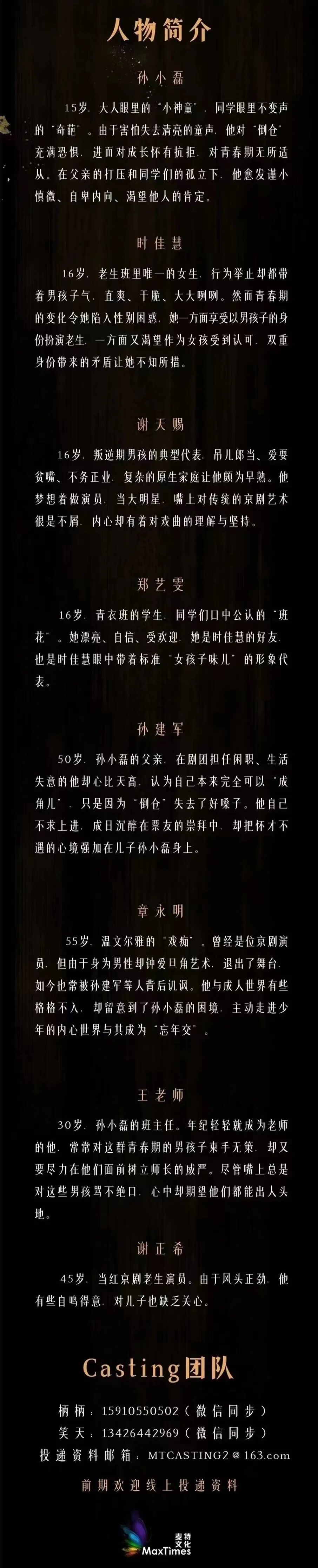 因疫情原因线上筹备,欢迎各经纪公司、经纪人及个人演员老师针对性推荐,期待合作!