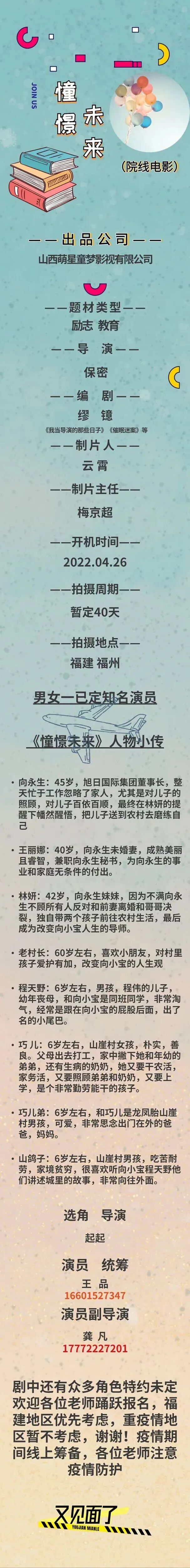 剧中还有众多角色特约未定,欢迎各位老师踊跃报名,福建地区优先考虑,重疫情地区暂不考虑,谢谢!