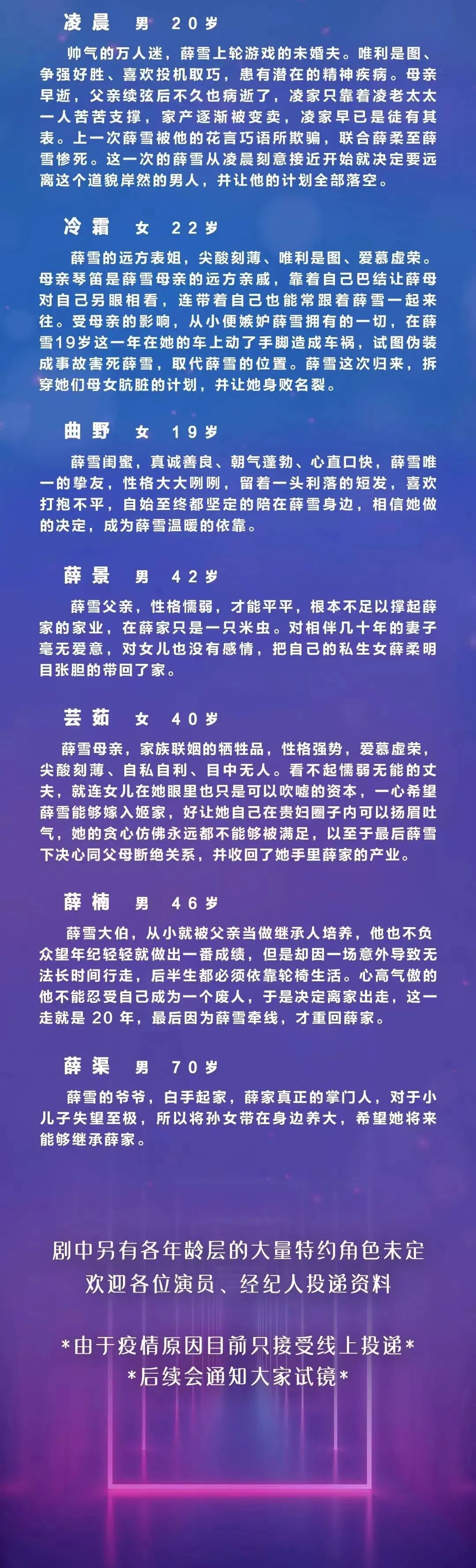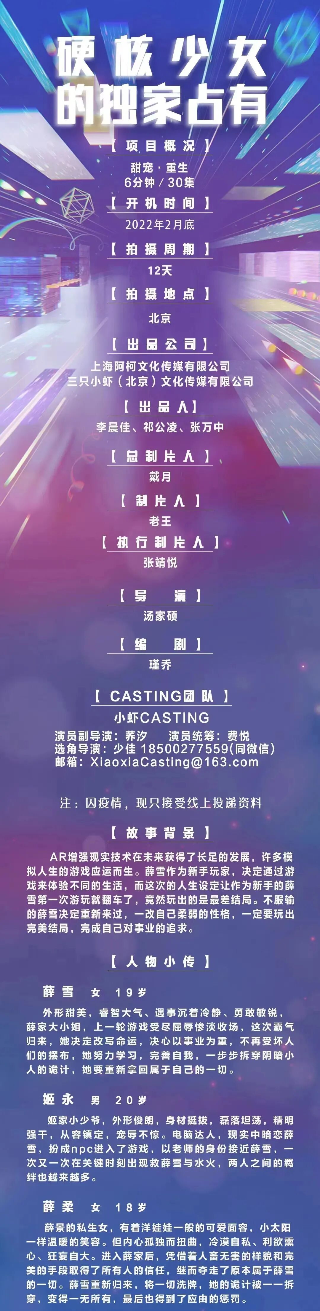 本栏目发布组讯由小编采集与业界共享,组讯如有变化请以实际情况为准。如果遇到剧组收费情况,请谨慎对待并私信官微@戏客Seeker,我们会公示问题组讯并及时处理。谢谢。