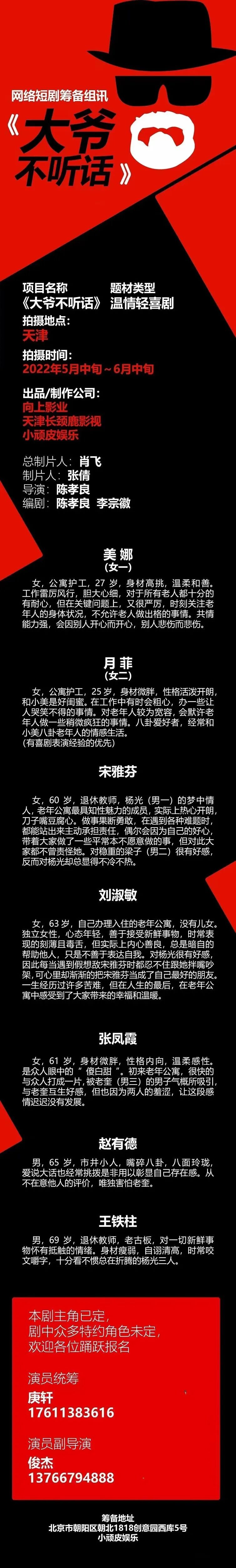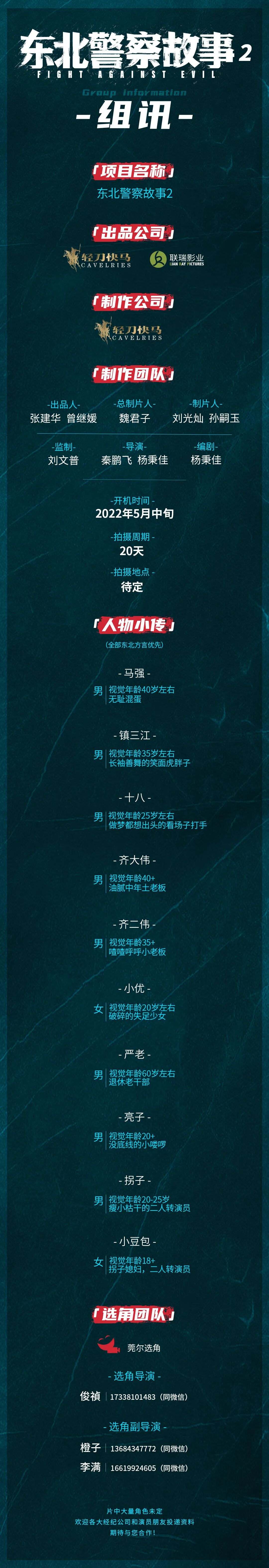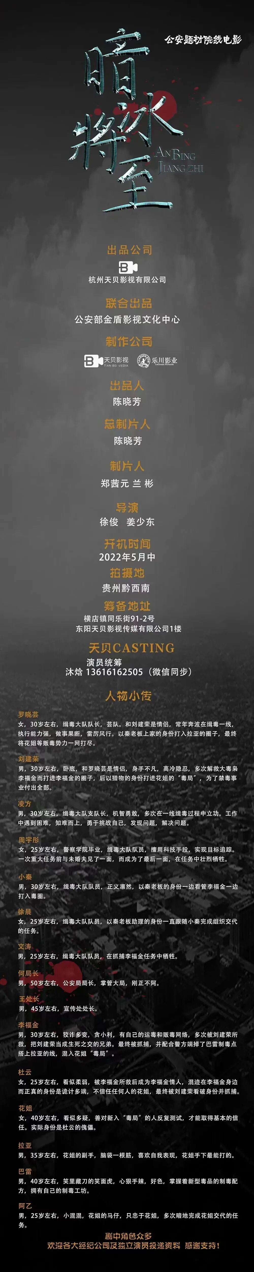 片中大量角色未定,欢迎各大经纪公司和演员朋友投递资料,期待与您合作!