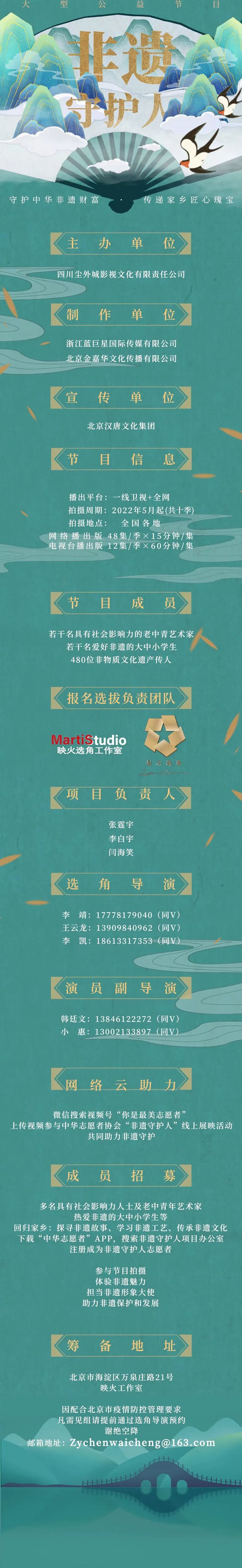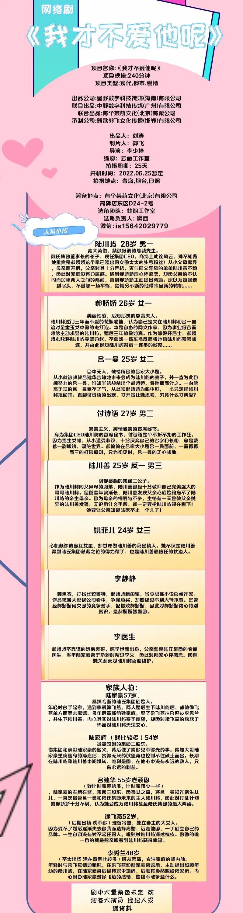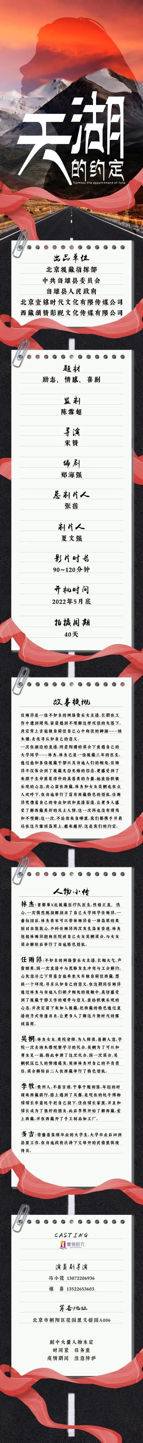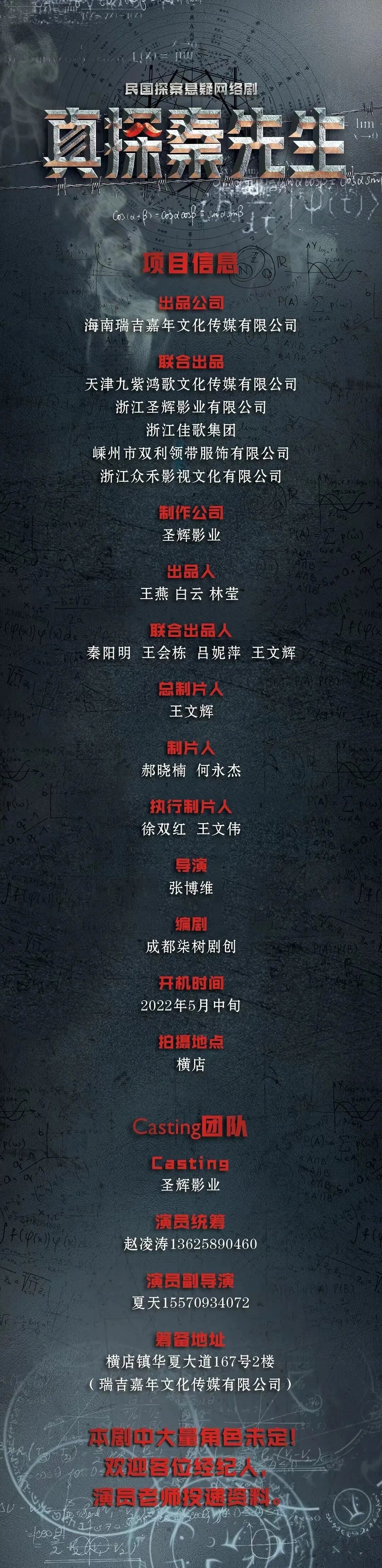 片中大量角色未定,欢迎各大经纪公司和演员朋友投递资料,期待与您合作!