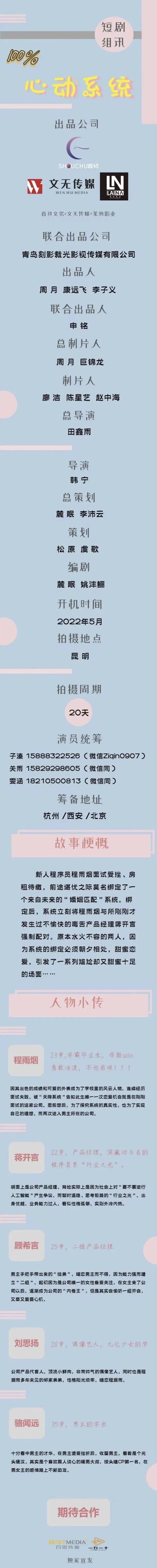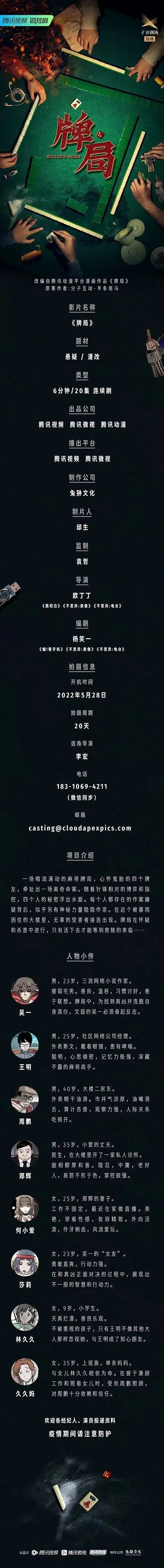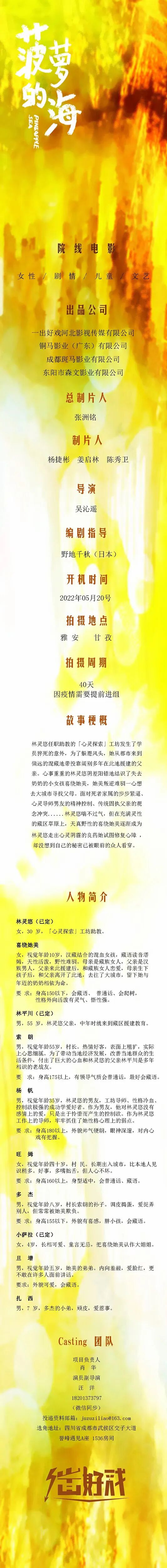 剧中角色众多未定,欢迎各经纪公司、演员朋友投递资料。