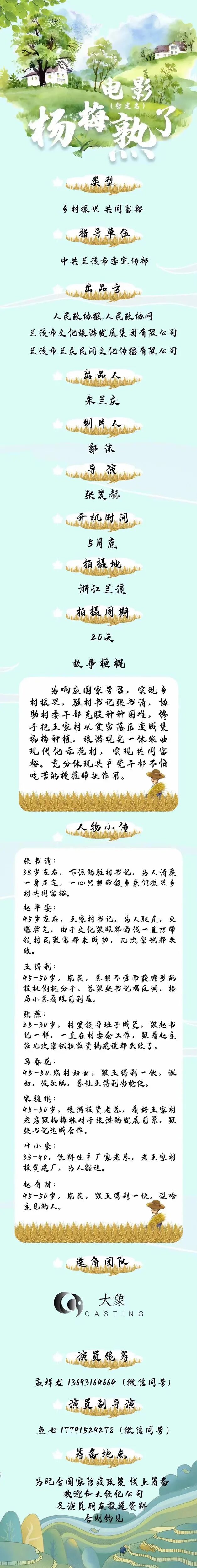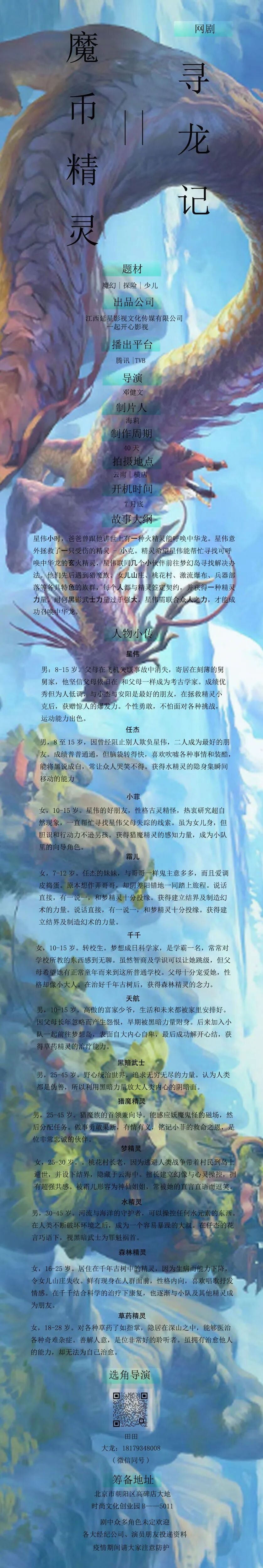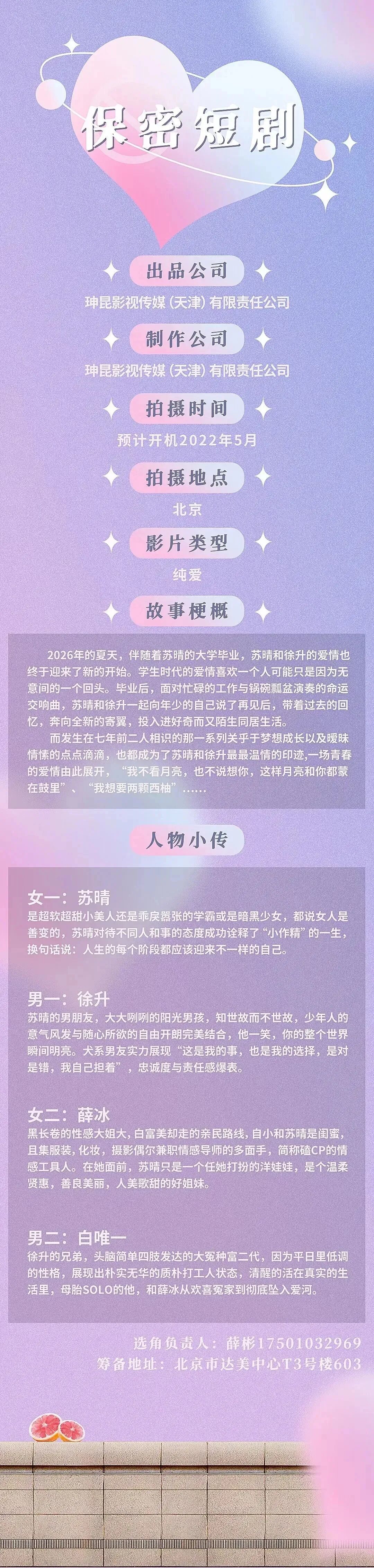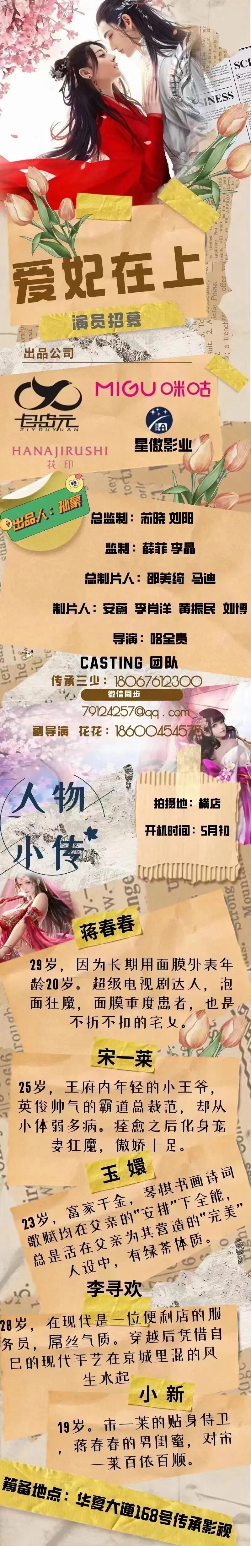 剧中众多角色未定,欢迎各大经纪公司、演员朋友投递资料,疫情期间请大家注意防护