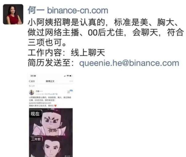 在币安的一些用户群中,曾出现数个颜值颇高的女性团队成员的身影,在当时为币安带来不少关注,圈内将之称为“币安101女团”,而这个女团正是由何一主导推出,她曾在朋友圈发布招聘启事,标准是“肤白貌美大长腿”。