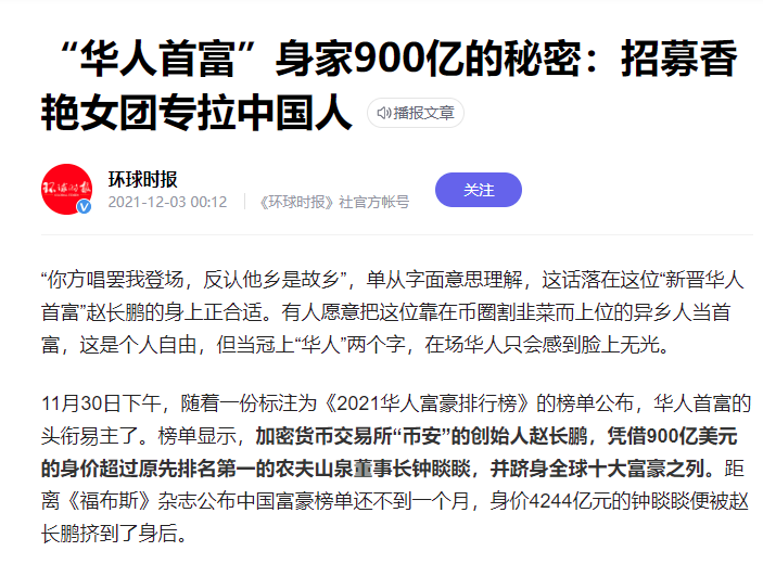 在中国人民银行等七部门联合发布《关于防范代币发行融资风险的公告》面前,赵长鹏承诺“不再为中国大陆地区用户提供服务”,不过据环球时报2021年底的报道显示,赵长鹏旗下的工作人员依然活跃在微博微信,不停地往币安交易所导流国内用户。
