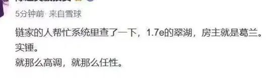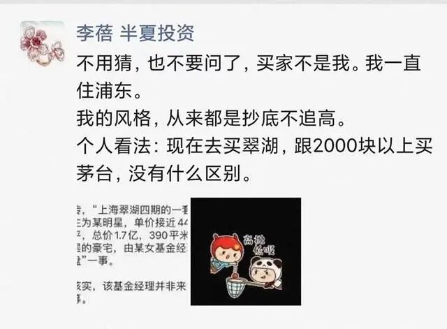 传闻有板有眼直指“私募大佬更倾向于闷声发大财”。在“私募魔女”李蓓出面辟谣,呛声自己不喜欢追高接盘,“现在去买翠湖,跟2000块以上买茅台没有什么区别”后,有雪球大V发文直接点名道姓,称豪宅购买者正是葛兰。