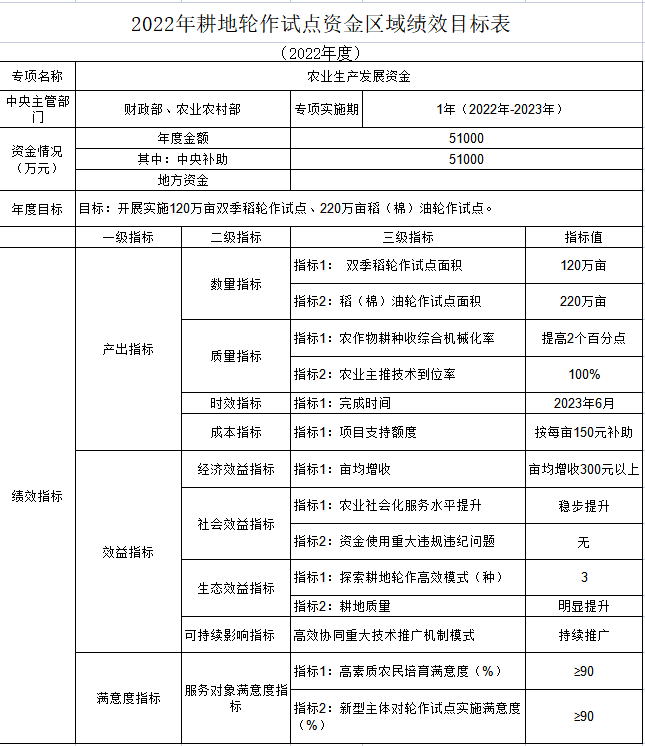 参考《湖南省财政厅关于提前下达2022年耕地轮作休耕试点资金的通知》,2022年中央财政共下拨51000万元,用于湖南开展耕地轮作试点。其中,开展实施120万亩双季稻轮作试点、220万亩稻(棉)油轮作试点,暂定补贴标准为150元/亩,目标增收300元/亩。