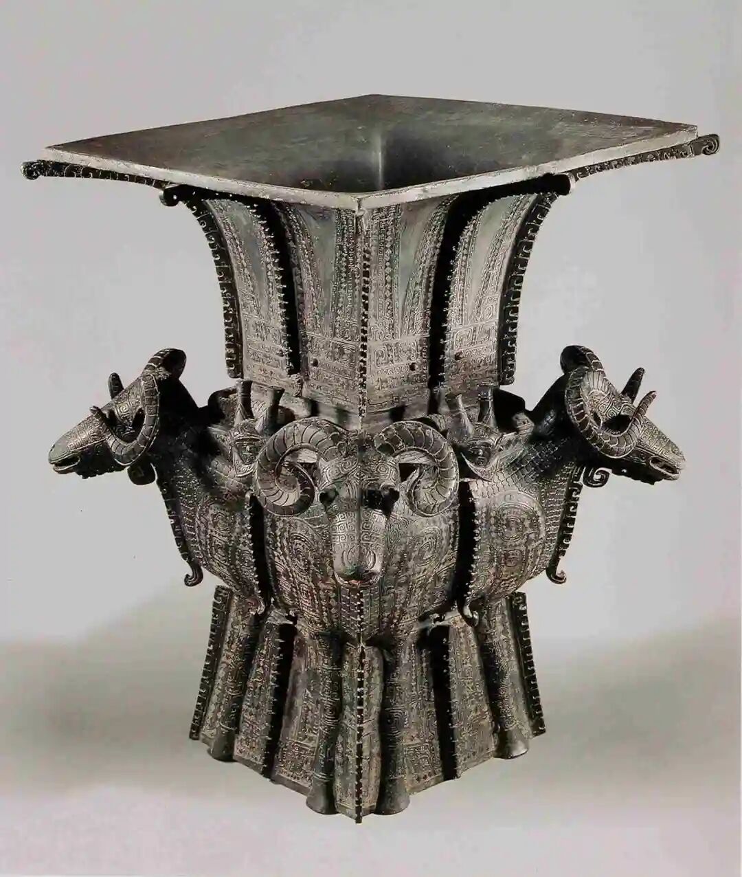 被追缴充公后,这宝贝也有了自己的名字,这古物每边边长为52.4 厘米,高58.3厘米,重量34.5公斤,器型很有特色,长颈同时颈部饰有三角夔纹和兽面纹,高圈足,颈部高耸而饰高浮雕蛇身而有爪的龙纹,四边上装饰有蕉叶纹、三角夔纹和兽面纹,而在这花纹中最令人瞩目的,当然是四面4个卷角羊头。于是,这个宝贝被称为四羊方尊。