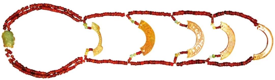 他的墓中还清理出大量精美的玉器,几乎囊括了当时的全部种类,最令人惊羡的是挂在墓主人胸前的一组大型七璜联珠组玉佩。虽然在地下伴随主人千年,却依然熠熠生辉。