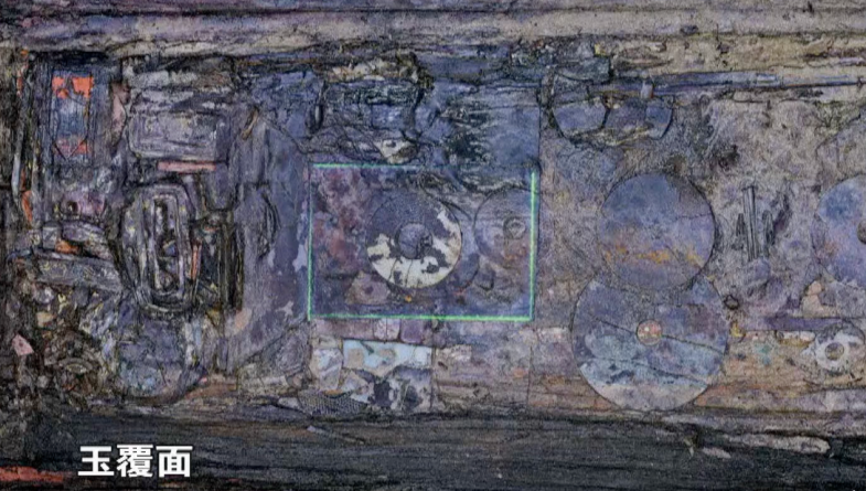 而海昏侯的玉覆面是一个梯形的漆盒,漆盒子中间镶嵌一块硕大的玉璧。在清理玉覆面的过程中,考古人员透过玉璧的圆孔,居然看到了两排牙齿牙齿!