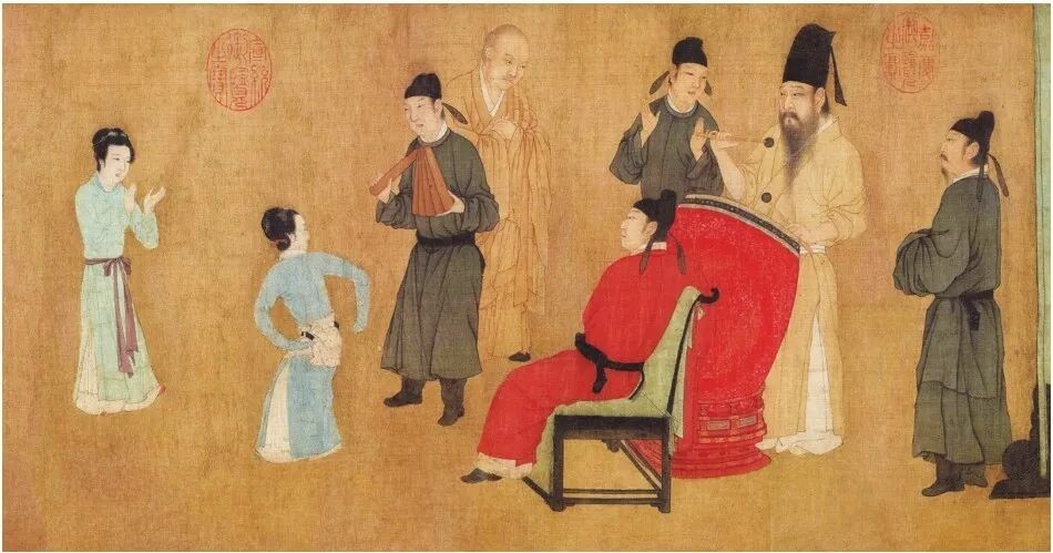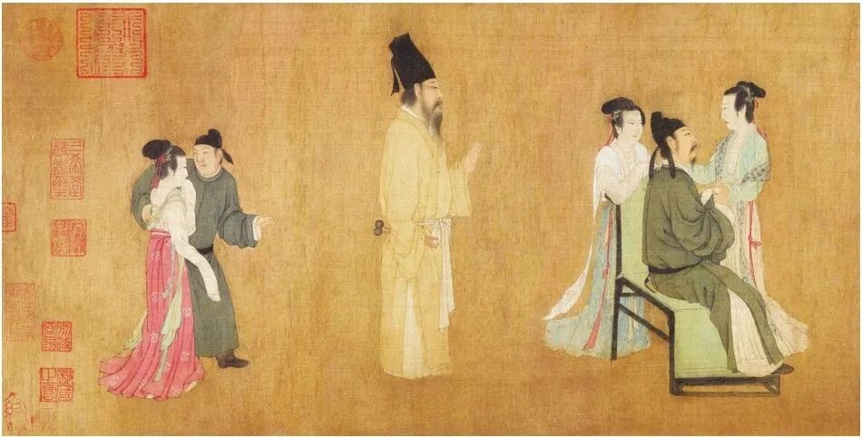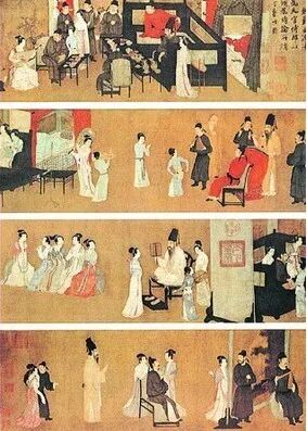《宣和画谱》记载:后主李煜要重用韩熙载,又听说他荒纵,于是让人去他府中赴宴,看看他的做派,画下来。