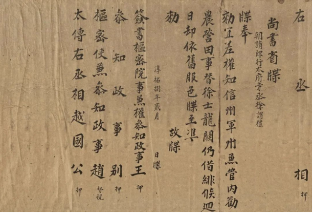 说了半天,这徐谓礼到底是什么人啊?据记载,徐谓礼生于宋宁宗嘉泰二年(1202),卒于宋理宗宝佑二年(1254),三十四年里,升迁了十二次,也只是从从九品升到了从六品,并不是特别显赫。相比,他的父亲徐邦宪倒是更有名些。徐邦宪在宋光宗绍熙四年(1193)参加科举考试,为礼部第一名,即省元。徐邦宪还是南宋著名文学家、状元陈亮的妹夫。徐谓礼虽然官做得不算太大,但家里人专门写了17长卷的文书,足见对他的宦海生涯还是十分重视的。