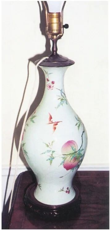 外国人特别喜欢台灯,尤其是中国陶瓷制作的。一般把瓷瓶或瓷罐底部打个眼儿穿过电线作底座。当年,奥格登的母亲在家里打算挑一个瓶子做灯座。她一眼就看上了这只瓶子,觉得这瓶和其他花瓶不一样,瓶子拿回家,她琢磨电线从哪儿穿过去,打算在瓶底打个孔。