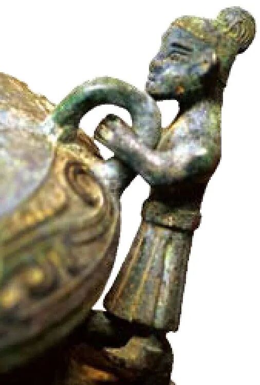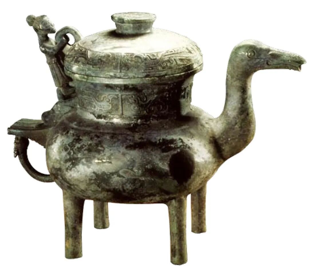 盉(hé)是中国古代盛酒器,是古人调和酒、水的器具,一般是圆口,深腹,有盖,下有三足或者四足。这件雁形铜盉的背部开有圆形器口,口上有盖,高领,盖与器身之间用一个上身裸露、下穿十褶裙的男人模样的铜人俑作为链条相连接。前有龙头形流口,后有曲体龙形鋬手,人俑脚下踩有一个牛头形浮雕装饰物。器盖与器颈部饰云雷纹衬底的凤鸟纹,器盖内铸有铭文40余字。奇迹!这么小的一座墓,竟会有这样精妙绝伦的珍宝 !
